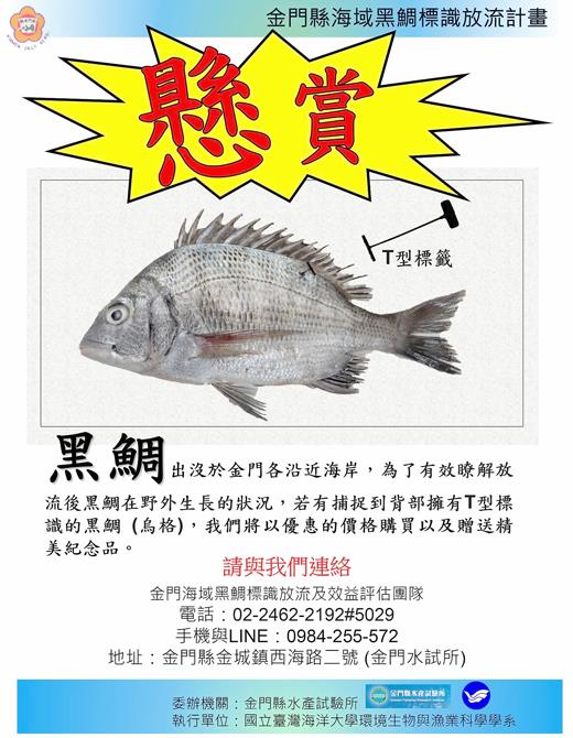 金門縣水產試驗所曾在今(一○五)年四月份於新湖漁港慈鑾宮、金門各釣具行及羅厝漁港等地,進行「金門縣黑鯛標識放流宣導說明會」,而在本(六)月十六日,住在武德新莊的林姓釣友回報指出,於四七高地釣獲有施打T型標籤之黑鯛一尾。水試所表示,放流之初即能回收樣品,對於後續的評估計畫有實質助益。 金門縣水試所於今(一○五)年委託國立臺灣海洋大學國立環境生物與漁業科學學系王嘉惠副教授,執行「黑鯛標識放流技術效益評估計畫」,受託的海洋大學研究團隊指出,去(一○四)年在臺灣所進行之計畫,共計放流五十六萬尾魚苗,而回報捕獲有一百一十七尾,實際回收樣品僅有二十三尾,因此今年金門在放流初始即能夠得到回收樣品,實屬難得,而且對於效益評估的計畫,有很大的實質幫助。 水試所表示,為達到迅速復甦地區海域的漁業資源,以彌補自然生產力的不足,該所每年均積極致力在培育本土性高經濟魚苗並辦理相關的放流活動。此次可以快速地得到回收個體,主要是在地的釣具行、漁會以及地區釣客們的配合及協助宣導,除了張貼海報外,亦使用LINE協助推廣。 水試所指出,日前在辦理宣導說明會時,與會者普遍都已知道相關訊息,讓水試所同仁及海大團隊非常感動。捕獲樣本黑鯛的林姓釣客表示,釣到黑鯛時,發現魚身上有T型標籤,馬上找容器盛裝,回家後立即通知水試所。水試所同仁前往確認後,的確是於去年十二月份所放流之黑鯛,而林姓釣友原先表示這是調查用的,要將魚體送給水試所,然這項評估計畫團隊為鼓勵並感謝民眾協助,仍以略高於市價購回並贈送文宣品來表示謝意。 水試所進一步的說明,今年所放流的黑鯛,將於背鰭下方打入「T型標籤」,如有漁民或是釣客捕獲有施打標籤的黑鯛,如體型較小(小於一斤)者,請協助拍照回傳放流效益評估研究團隊(手機或LINE:0984255572),如有捕獲一斤以上之標識放流黑鯛,放流效益評估研究團隊將會以略高於市價予以購回。敦請漁民及釣客共同加入漁業資源評估之行列,協助蒐集捕獲之標識魚種。