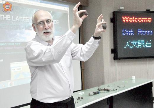 美籍國際隕石大師Dirk Ross,結束於屏東舉辦的隕石研討會後,在金城國中蔡松輝的邀請下,日昨現身賢庵國小、垵湖分校演講,以愛麗絲夢遊仙境的故事為引,帶學童認識隕石及他在世界各地追尋隕石的經驗,他大方贈送隕石給提問的學童,也希望學童能如故事一樣尋找那一把關鍵鑰匙,循線找到答案,化不可能為可能完成夢想。 Dirk Ross是美國籍,四歲就找到隕石,為了尋找墜落地球的隕石他的足跡遍及各地。他在屏東有相關的計劃,一年抵台三次展開培育工作,此次抵台赴屏東參加隕石研討會,並透過友人推薦下在金城國中蔡松輝聯繫及協助,日昨現身賢庵國小及垵湖分校,分享天文隕石。他以英文做介紹,透過賢庵國小英語老師張桂芳的翻譯,帶兩學童從顏色、重量、形狀、磁性等認識隕石,也說明他追尋隕石的經驗。並指出他去年九月、十二月以及今年三月,都找到一百公斤的隕石。而此次雖然沒有「隕石琉璃珠」,但他非常大方地將今年三月在非洲撒合拉沙漠撿到的隕石,贈送給學童,讓大家雀躍不已,發問相當踴躍。 Dirk Ross對於學童天馬行空的提問細心的回答,他以愛麗絲夢遊仙境的故事為引告訴學童,不要以為到美國NASA或登上外太空是難如登天的事,只要像故事中描述的情境找到那把關鍵的正確的鑰匙,無論是人生或是任何的學習都可以找對方向或答案,甚至循線完成夢想,他並舉例,「IMPOSSIBLE」其實是「I AM POSSIBLE」。 Dirk Ross樂見學童熱烈參與討論,他非常希望透過推廣吸引大家對天文、太空科學的喜歡。他並叮嚀學童好好收藏隕石,因為它是相當珍貴的禮物。Dirk Ross也表示他在屏東的教學計劃持續進行中,而在台灣培育太空人則是他的夢想。短短一天兩場的演講學童非常喜歡,也有人請假參與並形容非常值得!