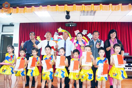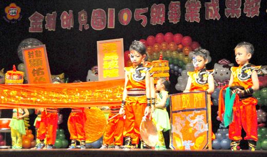 金城幼兒園一○五級畢業成果發表,昨日上午十時假文化局演藝廳舉辦,吸引大批家長前往觀賞,活動由大紫班「王爺出巡」率先登場,熱鬧的迎城隍故事也敲響整場表演序曲,各班將一學期學習主題融合成表演節目搬上台演出,不論是傳統原住民舞蹈、熱歌勁舞或貼近地區主題特色內容,皆相當精彩,也呈現幼兒園學習的內容多元及豐富。 昨日演出吸引大批家長前往參與,現場幾乎座無虛席,教育處處長李文良、金城幼兒園園長許碧華、金城鎮代會主席陳天成、家長會副會長王林斌、委員王中聖等出席欣賞。 活動由大紫班歡喜迎城隍開場,在鄭素雯、李孟芬、翁新慧三位老師指導下,學子模仿迎城隍陣容,喬裝成十二婆姐、官將首也在莊宗翰老師協助下訓練了鑼鼓隊,維妙維肖熱熱鬧鬧也為整場演出炒熱氣氛。而接續登場的班級也不是省油的燈。大粉紅-歡樂慶豐收,透過歌舞的方式,呈現原住民的豐年祭,部落慶祝稻米的豐收以及感謝祖靈和諸神明的保祐的歡樂景象。而大紅班的夏日繽紛狂想曲,則藉拉丁鼓、棒棒糖手鼓、鐵琴、鈴鼓、大鼓和立鈸等敲擊碰撞共同譜出美妙的樂章,交織出炎炎夏日裡最歡樂的童年時光。 大桔班-遙想總兵署,學子搭上時光機,重現總兵署的昔日風華。大綠班-廚師料理,手拿料理工具伴隨愉悅的舞步和輕快節奏,端出一道道金門道地美味料理。大黃班-我們結婚吧!學童以青春修煉手冊搭配歌曲,探討理想中公主與王子的愛情故事,也在學習主題中認識金門傳統婚俗。壓軸登場的大藍班,主題為高粱酒的美麗與哀愁,透過酒瓶道具、歌曲及背景聲音,說明金酒是世界知名的美酒,但喝多了會醉的,也會讓身邊的人生氣,課程中討論喝酒的壞處,藉演出闡述飲酒人內心的美麗與哀愁。