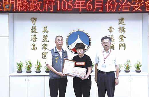 金門縣政府昨(16)日召開105年6月份治安會報,參議許寬在主持會議時,除了代表縣長陳福海頒發林亭儀小姐主動機警協助攔阻詐騙案感謝狀,他也強調,金門的治安守護靠大家,林小姐的熱心,讓金門的治安更美好,也讓我們看到警民合作無間的社會溫馨。 會中,也由縣警局報告上次會議主席指裁示事項執行情形,其中一案,教育處、學校應就高關懷對象,分析其特殊背景、家庭因素,研議相關輔導課程,成立輔導單位,以有效輔導偏差行為學生能走向正途。對此,承辦單位教育處指出,有關高關懷對象乙節,該處依推動「友善校園」學生事務與輔導工作計畫辦理。請各校加強嚴重適應困難及學習意願低落學生之生活輔導及道德教育,以涵養優良品德,增進其社會適應能力。提供學習意願低落學生另類教育課程及技藝教育,協助其生活與學習適應。 除此,有關105年5月份治安狀況分析,警察局也在會中進行了專案報告,在刑案統計上,本期全般刑案發生80件,破獲63件,破獲率79%。發生數較去年同期67件,增加13件。破獲數較去年同期50件,增加13件。破獲率較去年同期75%,增加4%。 另縣警局分析105年1-5月份受理詐欺案件被害人年齡,以20歲以下(13人)佔39%最多,21~30歲(12人)佔37%次之,31歲以上(8人)佔24%再次之。而分析105年1-5月份受理詐欺案件被害人職業,以學生(16人)佔48%最多,軍公教(5人)佔15%次之,服務業(4人)12%再次之。 再者,會中也由觀光處報告旅館、民宿稽核工作,而為強化防範社會高風險族群隨機傷人事件,縣警局刑警大隊也就建立社會安全網絡聯繫機制提請討論,期能透過密切協調合作及資訊連結共同防制,遇有個案發生即成立專案小組,適時關懷及提供協助,追蹤管制,以確保民眾生活安全與被害救助權益。