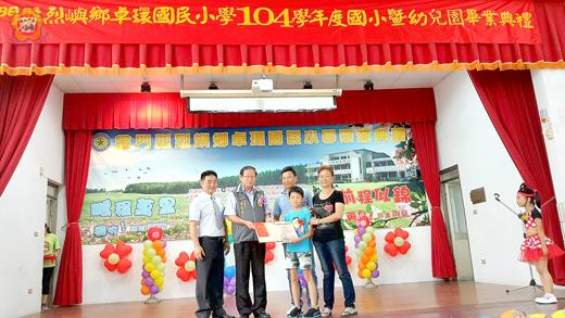 上岐國小六位畢業生在寒假以「挑戰自我極限」的方式步行南台灣五十公里,昨日的畢業典禮,校方也特別以「圓夢岐跡」為活動主題,和來賓、家長一起分享畢業生一步一腳印,在南台灣留下深刻足跡與豐富的回憶。縣府教育處副處長陳金文、烈嶼鄉長洪成發、鄉代會主席洪若珊等來賓很稱讚校長謝華東和教師用心發展多元教育的工作,看到了孩子在學業、技藝、藝術以及體育的努力果實。 上岐國小104學年畢業典禮,昨日上午十一時舉行,教育處副處長陳金文代表陳縣長來祝福學子們完成階段學業,也語多勉勵。鄉長洪成發、鄉代會主席洪若珊、副主席洪燕玉、鄉代表方水萬、陳秀治、吳福全、退休校長林水綠、洪天佑、上岐村長洪天南、青岐社區發展協會理事長洪正雄、學區校長、退休教師以及各界來賓到場表達祝福,受到校長謝華東、家長會會長余泓麟和師生的歡迎。陳金文很感動來賓和家長會、家長參與的熱絡,活動現場人氣十足。 校長謝華東帶領教師團隊致力發展多元教育,鼓勵多元活動,提供學生發揮潛能的舞台,激發小朋友的自信心。在昨日的畢業典禮中,來賓和家長們看到了每一位小朋友在不同學習領域的成績,除了「省主席獎」洪暄琇、「縣長獎」洪琬妤,還有運動績優獎、博學多聞獎、勇於表現獎、小小美藝家獎、口語表達獎、小小探索家獎、喜愛閱讀獎、喜愛繪畫獎、創意點子王獎等,鼓勵小朋友適性發展,幫助學生認識自我、悅納自我、實現自我。 游泳、體適能以及英語是上岐國小列為三項發展特色教育,六位畢業生順利通過測驗,昨日由校長謝華東頒發學校三項發展特色教育認證證書。謝華東也頒發小鐵人證書與金頭腦獎,並頒發畢業生通過師德兒童英語檢定證書,家長開心分享孩子努力學習的成績,感謝教師們用心的教導。九位幼兒園畢業的幼生也獲得獎勵。 活動中也穿插小朋友的節目表演,每一班的在校生輪番登台,表達對學長、學姊的祝福,天真無邪的話語,增添活動的溫馨氛圍。午間,全校師生和來賓、家長一起在校園享用學校午餐,謝華東感謝大家的參與,拉近彼此間的情誼。