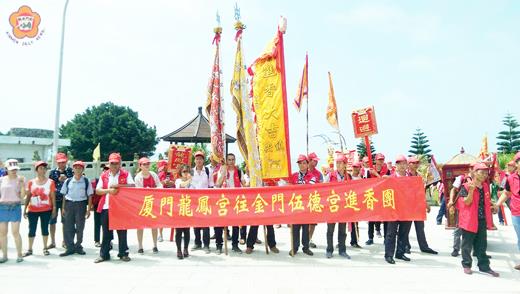 宗教交流■龍鳳宮至■伍德宮進香 記者 /報導 廈門翔安新墟鎮上宮村的龍鳳宮,日昨共有140位鄉親來到金門金湖鎮新頭伍德宮進香,熱鬧滾滾;該宮主祀的蔡王爺乃是伍德宮蘇府五王的分乩,廈門翔安的龍鳳宮於去(104)年落成舉行奠安慶典時,新頭伍德宮也前往進行宗教巡禮,彼此經常相互交流。 金湖鎮新頭伍德宮神威顯赫,分靈各處,繼上個月福建省晉江市東石鎮萬德殿特別抵金進香後,昨日又有來自廈門翔安新墟鎮上宮村的龍鳳宮前來進香,新頭鄉親與地方耆老們熱烈歡迎,金湖鎮民代表陳向鑫亦前往共襄盛舉,一行人聲勢浩大,熱熱鬧鬧迎接地區的宗教盛事。 伍德宮管委會主委陳鈞曹表示,本次前來金門謁祖進香的是廈門翔安新墟鎮上宮村的龍鳳宮,該宮主祀的蔡王爺乃是伍德宮蘇府五王的分乩;非常感謝翔安鄉親不計路途遙遠與炎熱氣候,來到金門謁祖進香。 來自廈門翔安龍鳳宮的團長蔡欉表示,這一次共有140位鄉親一起來進香,預計在金門停留兩天時間,而這已是自民國100年來,他們第3次前來金門新頭伍德宮請火,也特別感受到金門鄉親的熱情,況且兩岸本是一家,感覺非常熟悉。他也說,廈門翔安的龍鳳宮於去年落成舉行奠安慶典時,新頭伍德宮的鄉親也前往進行宗教巡禮,彼此經常相互交流,聯絡雙方情誼。