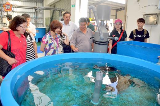 圖文/陳冠霖 金門縣議會16日赴澎湖參訪「澎湖海洋生物研究中心」,由解說員帶領參觀該中心養殖的多樣海洋生物,其中看到保育類動物綠蠵龜,在飼養池內悠遊游著,且體型由小到大都有,分養在不同的飼養池中,由於難得這麼近距離看到綠蠵龜,讓眾人驚嘆不已。