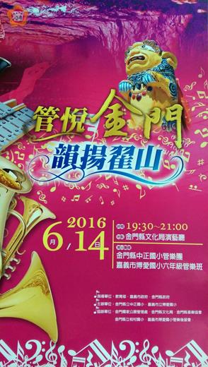 由中正國小管樂團與嘉義市博愛國小六年級管樂班的應屆畢業生們共同聯合演出的「管悅金門‧韻揚翟山」管樂演奏會,預定將於今(十四)日晚間七時三十分起,在金門縣文化局演藝廳盛大公演,歡迎熱愛管樂演奏的鄉親,踴躍前往聆聽欣賞,來感受這群小小演奏家的精湛技巧吧。 嘉義市博愛國小管樂班的六年級應屆畢業生,於昨(十三)日起來金,預計在金門進行為期三天的參訪行程。此外,還將於今日晚間七時三十分起至九時為止,在金門縣文化局演藝廳「管悅金門‧韻揚翟山」管樂演奏會,與中正國小的小樂手們為民眾演奏。 嘉義市博愛國小管樂班應屆畢業生,於六月十三日抵金,將在金門停留至六月十五日為止,進行三天的參訪與演出。而今日下午則將與中正國小進行管樂交流後,還將選在晚間七時三十分至九時,在文化局演藝廳與中正管樂團舉辦聯合演出,為愛好管樂的金門聽眾獻藝。 由於近日氣候多變,陰雨不斷,博愛國小表示,如果天氣許可,該校也預計在今日上午九時三十分至十時三十分左右,前往翟山坑道參觀,並在坑道中嘗試進行管樂演奏,讓孩子們體驗一下,在不一樣的演奏場域的感覺。 今日晚間的管樂聯合演奏會,中正國小管樂團將會擔綱上半場的演出,預計演奏「光之城市」、「星際大戰」、「聖彼得堡進行曲」等曲目;博愛國小音樂班則是負責下半場演出,將會吹奏「愛的協奏曲」、「友誼的回憶」及「我只在乎你」、「再見我的愛人」等多少家喻戶曉的曲目,希望帶給金門聽眾一場不一樣的音樂饗宴。 博愛國小校長周孟志表示,博愛國小管樂班成立於民國九十四年,最近幾年該校管樂特色已逐漸闖出名號,在一百、一○二、一○三、一○四學年度均曾經榮獲全國賽室外行進管樂特優第一;於一○三年更是代表嘉義市,前往上海參與國際音樂節的演出,管樂班可說是學校辦學的一大特色。 二十八年前曾經在屬於戰地前線的金門服役,校長周孟志進一步表示,當時在金服役的他支援金東師部政戰隊,曾經在陽翟金東大戲院旁的陳姓宗祠中駐防將近兩年。如今能夠再度率領博愛國小管樂團來到金門演出,有一種「回家」的感覺,雖然景物、人事都已不在,但金門人的熱情民風依舊,也讓這次的金門行倍感溫馨。而管樂發展源自歐洲軍樂,以其雄壯渾厚的樂聲,用以激勵戰士們高昂的士氣;金門是屏障台海的前線,許多人均曾於此付出青春,也讓這塊土地值得用管樂為其獻藝,希望悠揚的樂聲,獻上對金門最高的敬意。