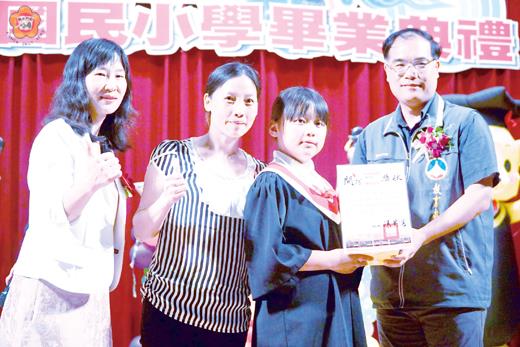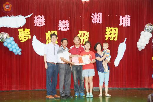 「戀戀湖埔、夢想起飛」!金寧鄉湖埔國小昨日舉辦舉行105級畢業典禮,十三位國小部畢業生以及九位幼兒園畢業生在校長、老師、家長的祝福下,畢業展開另一階段的學習旅程。校長楊肅藝勉勵每位畢業生在人生學習的旅途中,要把握當下,盡力做好自己該做的事。 湖埔國小一○五級畢業典禮暨聯歡活動於昨日上午九時起在湖埔國小學生活動中心舉行,由校長楊肅藝主持,縣府教育處督學吳祥坤、議員楊永立,以及金寧鄉長陳成勇、鄉代會主席陳成泉、金城國中退休校長楊瑞松,古寧國小校長楊成業,鄉代表李正騰等以及家長會會長楊秀清及委員、學生家長等貴賓到場,一同祝福畢業生鵬程萬里。 昨日典禮現場,與會貴賓應邀頒發縣長獎、議長獎以及各項領域上表現優秀的學生獎品與獎狀並向畢業生表達祝福之意,家長也上台合照分享孩子成長的喜悅。而家長會會長楊秀清致贈每位國小畢業生一部腳踏車。副會長楊忠俊與林正士致贈幼兒園畢業生每人書包一個。現場並穿插民俗技藝跳繩表演,還有在校生精彩的舞蹈表演,場面相當熱絡溫馨。