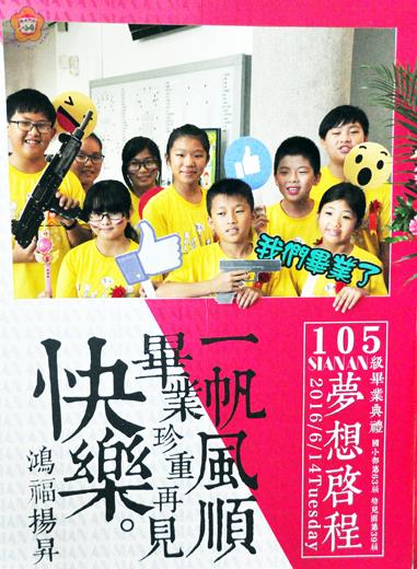 金門縣金城鎮賢庵國小暨垵湖分校,昨假文化局演藝廳舉辦一○五級畢業典禮,氣球、彩帶、飛機冉冉上升、全體畢業生在舞蹈下揭開序幕,也象徵五十九位畢業生夢想啟程。除了頒獎表揚外,現場陳列學生才藝展以及畢業生人生地圖,學子手繪他們的小小心願;畢業拍照背板巧思設計,讓離校的畢業生和好友及家人合影,留下永恆的記憶。 賢庵國小暨垵湖分校昨日舉辦一○五級畢業典禮,畢業生在張桂芳、龍方蕙、陳雯琤、張秀如、張博裕老師指導下,每人做出一張人生地圖,內容除了有生涯規劃,也有和三五好友的約定,完成人生大事的時間,夢想以及老年生活。有人要到國外闖蕩開店,有人夢想當廚師,也有人退休後要環遊世界,更有人要活到一百歲,道盡畢業生自我的理想和目標。 而整場畢業典禮頗俱巧思,不僅有學生美展,替代役男魏佑峻為今年畢業典禮打造專屬拍照背板,讓畢業生、師生、親子彼此為小學六年時光留下難忘又珍貴的畫面。典禮除了表揚績優學子也頒發《為愛點燈》親職教育家長獎,共計有十五對學生家長獲獎。典禮最後進行才藝表演,讓充滿祝福的畢業典禮增添歡喜熱鬧的氣氛。 昨日,包括縣長陳福海、秘書(兼本報社長)陳世保、秘書(兼林務所所長)葉媚媚、教育處處長李文良、金城鎮鎮長石兆瑉、代表會主席陳天成、議員陳滄江和畢業生親屬到場獻上祝福。縣長陳福海表示,賢庵國小在歷任校長的用心下,是地區具指標的學校之一。實現《禮記禮運大同篇》讓老有所終,壯有所用,幼有所長,是縣府重要政策之一,尤其是教育。俗話說,窮不能窮教育。縣府對於學校之所需全力支持,也期許讓所有人從幼兒園到大學,受到良好的資源培育。