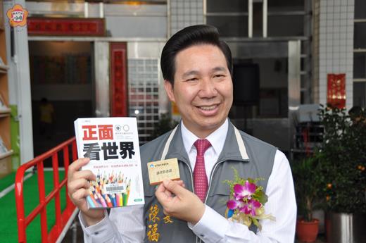 李增汪/圖文 「正面看世界」!這是縣長陳福海昨日主持金門縣文化局巡迴圖書車啟用儀式,辦理「讀者借書證」當場借的第一本書,他並重申正面力量的重要性,也期待縣民多閱讀,讓金門全島處處飄書香。