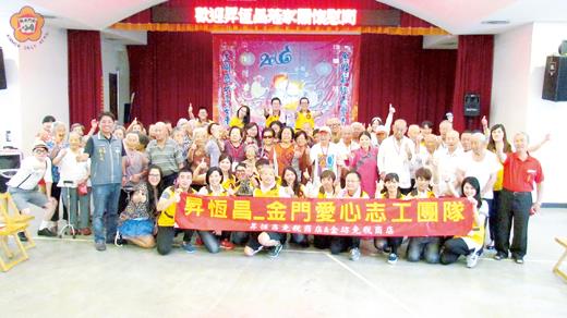 昇恆昌深耕金門,在金門到處走透透,關懷弱勢,持續把歡樂與愛心帶給金門地區需要幫助的單位。志工團隊昨(15)日上午前進大同之家,帶著滿滿的愛心、熱血與創意,與50多位長者一起開心同樂。 昇恆昌金湖廣場規劃愛心志工活動,並出動超過20位志工,前進金門大同之家,關懷平均80歲以上的長者。活動先由身穿學生制服的志工們帶領歡樂「健康操」,並調整成適合長者一起唱跳的動作,讓大家動一動暖暖身,揭開序幕;接著進行「比手畫腳」動動腦時間,藉由志工豐富的肢體動作,看誰的領悟力比較高,答對就能獲得小禮物,題目包括剖蚵、迎城隍、風獅爺、高粱酒等金門特色謎題,趣味性十足;當然還有重頭戲-志工精心裝扮的「懷舊金曲歌舞秀」與「卡拉ok」時間,志工們化身為蚌殼精、公揹婆,還有自製的小轎子,彷彿是舞台劇一般,聽覺與視覺的娛樂效果一次呈現,大家一起歡唱K歌,把大同之家營造成老小孩的遊樂園,環繞著歡笑與樂聲。 昇恆昌金湖廣場副理李志明表示,這次是昇恆昌愛心志工隊第5次來到大同之家,每次都非常用心規劃每一個活動,包括重陽敬老團康闖關遊戲、中秋烤肉、包水餃等活動。這次以更有創意的活動還有裝扮來呈現,期待藉由各種方式,把歡樂與關懷帶給長者,除了大家動一動手腳、動動腦猜一猜,更希望長者們打開金嗓,讓生活增添更多趣味與正面能量。昇恆昌公司表示,未來也將持續深耕金門,關懷更多需要幫助的單位,把愛傳到金門的每一個角落。