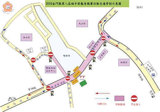 五月五划龍舟、迎端午!2016金門縣第八屆端午節龍舟賽將於明(9)日在雙鯉湖隆重登場,縣警局金城分局為使活動能順利圓滿進行,將於是日針對活動地點雙鯉湖溼地周邊寧湖路、頂林路及南北山等路段進行交通疏導管制,管制時間為上午8時至下午6時,金城分局分局長吳山連籲請前往龍舟競賽或觀光景點的民眾,礙於活動場地周邊停車空間不足,多利用公共運輸前往,同時駕駛人於行經活動路線周邊道路時,請減速慢行或提前改道行駛,避開管制路段,避免造成不便,並遵守各路口執勤員警指揮疏導,嚴禁違規停車。 金城分局為維護參加龍舟賽活動人員及工作人員安全,活動當天管制措施如下: (一)寧湖路管制區域,自雙鯉濕地自然中心後方往「南山村道路與寧湖路路口」至「寧湖路與頂林路口」,禁止車輛進入寧湖路。 (二)雙鯉溼地自然中心前方路段管制區域,由「南山村1-5號旁交叉路口」至「寧湖路與寧湖路雙鯉湖前路口」,禁止車輛進入。 (三)由慈湖沿寧湖路往古寧村方向行駛車輛,於雙鯉濕地自然中心後方要往南山村方向,於「寧湖路與往南山村方向路口」左轉,禁止汽車直行進入會場;機車可由管制點單邊停放至寧湖路與雙鯉湖前路口。 (四)沿頂林路往古寧國小方向行駛車輛,在寧湖路與頂林路口,禁止汽車左轉進入會場,車輛直行往北山村行駛;機車可由管制點單邊停放至古寧村辦公處。 (五)古寧村北山往寧湖路方向行駛,在寧湖路與頂林路口,禁止汽車右轉進入會場,請直行頂林路。 (六)於南山村3號旁交叉路口禁止汽車往雙鯉溼地自然中心方向行駛;機車可由管制點單邊停放至南山1-5號旁交叉路口。 (七)請汽車駕駛人於管制區外,沿寧湖路、頂林路依序排列單邊停放,對向車道路邊、轉彎處及路口一律嚴禁停車。 (八)機車可停放於古寧村辦公處與雙鯉湖間道路,或古寧村辦公處前至林厝產業道路。 (九)救護車、消防車、執行公務等相關車輛,開放行駛管制區。