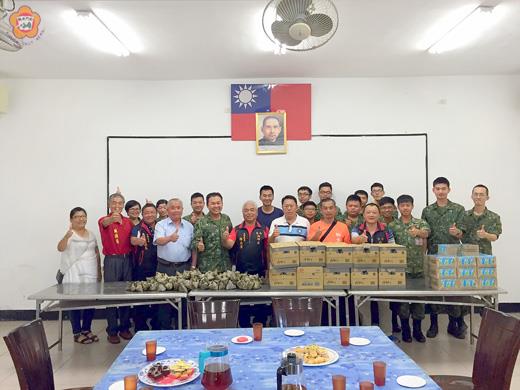 端午節即將來臨,金城鎮北門社區昨(七)日舉辦端節包粽活動,部分製作完成的粽子,於昨日下午由社區理事長陳介尊帶隊,前往金門防衛指揮部混砲營慰問營區的官兵弟兄,祝賀佳節愉快。 昨日下午,由北門社區發展協會理事長陳介尊、北鎮廟管理委員會主任委員傅啟澤、北門里里長許績才、以及金城鎮代表會代表林金英與北門志工隊成員等人,前往慰勞混砲營。 社區理事長陳介尊表示,端午節將至,北門社區也相當感謝混砲營的弟兄們,平時也時常協助支援社區的多項活動,因此特別利用端午節前夕,與社區志工們一同前往慰勞,感謝他們的奉獻。