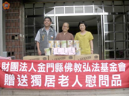 端午佳節將至,為表對本縣獨居長者關懷之意,金門縣太武山海印寺暨金門縣佛教弘法基金會昨由真化法師及志工攜帶燕麥多榖粉155份,委由金門縣政府社會處轉送全縣獨居長者,由社會處處長甯國平代表接受,甯國平也代表陳福海縣長感謝太武山海印寺暨金門縣佛教弘法基金會長年來對本縣獨居長者的關懷與照顧。 金門縣太武山海印寺暨金門縣佛教弘法基金會每逢三節│春節、端節、秋節前夕,均會提供獨居長者慰問品,委請金門縣政府社會處代為轉贈,這項溫馨又感人的關懷活動,十餘年來從不間斷,受益長者高達五、六千人次。 此外,縣府透過社會處綜合福利服務志工隊與五鄉鎮公所綜合福利志工隊志願服務經驗之連結,於年度三節也都會同步辦理慰問活動,由各公所志工前往轄區內獨居長者家中訪視,就其居住所作環境清潔打掃,關懷問安,並轉發金門縣佛教弘法基金會慰問品乙份。社會處綜合志工隊則前往金門縣私立晨光教養家園、福田家園及松柏園辦理關懷訪視,與晨光教養家園、福田家園及松柏園的身心障礙朋友提前歡渡佳節,除了適時展現縣府行動關懷的張力,也讓三節的慰問活動載滿無限的溫情。