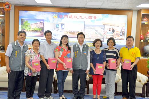 今年端午節即將到來,為感謝全縣各鄉鎮志工平時的熱忱服務和犧牲奉獻,金門縣長陳福海昨日下午接見社會處和五鄉鎮志工隊隊長,除了致贈端節禮物賀節,並提示社會處透過預算編列,讓志工隊未來能走出去,藉與外縣市交流,汲取別人好的經驗,來讓志工更學習成長,服務更專業化。 陳縣長也以宜蘭縣政府行政效率高,許多地方都值得金門縣來借鑑學習,像行政園區規劃打造、釋出軍事營區活化利用、社區營造等,都是可參考學習的地方。他也以社區營造和政府息息相關,是希望透過有好的環境,加上社區志工的融入,以就近照顧方式,在社區能有托老、托兒的服務。 這項接見和贈送五鄉鎮及社會處志工隊長端節禮物活動,昨日下午四時三十分在縣長室舉行,社會處長甯國平等人在場作陪。 陳縣長昨接見的六位志工隊長,分別是金城鎮吳聯福、金湖鎮陳玉梅、金沙鎮黃秀英、金寧鄉蔡素芬、烈嶼鄉林德明(副隊長)、社會處蔡翠淑。