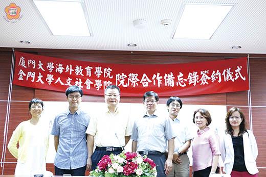 國立金門大學人文社會學院與廈門大學海外教育學院,共同簽署「院際合作備忘錄」,透過合作平台,未來兩校彼此互利共享資源,提昇跨域學習效益。 簽約儀式由金大副校長陳建民與廈大海外教育學院院長鄭通濤代表雙方,在金大共同簽署「院際合作備忘錄」,金大謝奇懿主任與雙方師生等多人均在場共同見證此一盛事。 金門大學表示,金門位處兩岸交通樞紐,與廈門一衣帶水、隔海相望,因此金大與廈大兩校交流,有其指標性意義,藉由此次雙方所簽訂的合作計畫,將有助於提昇雙方在教育、語言、文化等相關面向之學術合作。 金大指出,104年與廈大共同舉辦聯合學術研討會;同年金大華語文學系師生,也組團前往廈大海外教育學院進行參訪,除了參訪校園環境,也進入華語教學課堂觀課,共同進行兩岸華語文相關測驗及對比分析研究;近年來,雙方時相往還,互動熱絡。此番合作,更將推升金、廈人文教育領域之合作關係,優化教學品質,嘉惠兩岸學子。