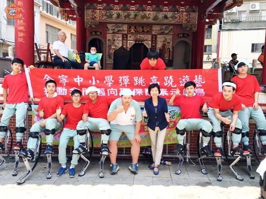 「甩開地心引力」,彈跳蹺能飛,今年農曆四月十二日迎城隍廟會慶典活動,當日現場封街迎神場面好熱鬧,神輿、民俗特色陣頭遊街繞境,熱滾滾。金寧中小學國中部十二位環保志工學生組成的『彈跳高蹺』隊伍,首度「亮相」表演彈跳蹺,學生穿著裝有彈簧的高蹺,沿途表演活力四射的彈跳,讓觀眾們耳目一新。 傳統廟會慶典常見的傳統技藝踩高蹺,演出者站在高蹺上,一邊走動,一邊表演,是很多人成長的共同寶貴記憶。今年迎城隍的迎神場面好熱鬧,寧中小學生組成的『彈跳高蹺』隊伍,在校長陳雅蘭、教練李振龍的帶隊下,參與迎神繞境活動,展現平日的技藝訓練成果。在眾人注目的眼光中,學生們表演國外很風行的一種彈跳蹺,由於有彈簧,踩在上頭就能跳躍,學生們彷彿腳底裝了吸盤,暫時擺脫地心引力的束縛,享受跳躍運動的快感,學生腳蹬高蹺到運動自如,平衡感的好身手,贏得現場觀眾的掌聲,學子們很有成就感,也讓大家看到了時下年輕人正夯的「彈跳蹺」運動。 寧中小校長陳雅蘭表示,十二年國教強調多元、適性學習,該校無論是國小樂樂棒、太鼓隊、國中小的拔河、長跑、接力、游泳、童軍等運動項目,學子們展現自我的能力和團隊精神,表現都很優異,國小樂樂棒、太鼓隊在全國競賽的激烈競爭下,還名列前矛,為學校爭光,也為金門爭取榮譽,更重要的是從運動中培養孩子的堅強、勇敢、面對困難勇往直前的精神與毅力。 陳雅蘭指出,彈跳高蹺訓練教練是來自馬來西亞華僑李振龍,他義務教導這群孩子投入資源回收的環保工作,動手回收學校平日的午餐果皮,製作成環保酵素,提供學校打掃清潔用,這一次迎城隍活動,也贈送民眾1000瓶的環保酵素,廣受歡迎,推廣環保生活的概念,更希望將金門打造成全世界第一座環保酵素示範島。李振龍帶領學生們課餘製作酵素,也訓練彈跳高蹺的技藝,推廣「彈跳蹺」運動。 陳雅蘭非常感謝李振龍千里迢迢來金門傳授專業和技藝。陳雅蘭說,學校重視學生品德的培養,除了習得才藝及運動技能,也要學會與人合作、協同做事的能力,要要懂得接納、包容、欣賞、與人分享,知福惜福,感恩回饋。李振龍長期義務帶領寧中小孩子學習課堂、課本以外的知識,愛孩子、感動孩子、改變孩子,付出教育的精神,讓人感動。 李振龍表示,彈跳高蹺的結構簡單,設計十分符合人體工程學,簡單易學,只要稍加練習,使用者就可以輕鬆掌握這種特別的走路方式。起初學生們也是存著好玩的心玩玩,因為帶上這副『彈跳蹺』,人人會有一種超越本能、超越飛翔的感覺,像武俠片中的武林高手一樣,更有超人和變形金剛與阿凡達般的威猛與無敵感。李振龍說,好奇的朋友們想像一下,讓你一下子身高2米以上,一步跨出3米遠,如同阿凡達那般奔跑,但你完全不用去另一個世界,更不用把臉塗藍或長出辮子,感覺很酷吧? 李振龍指出,跳躍高蹺又稱彈跳龍、彈跳器,還有Skyrunner、RiserRaptors、Powerbocking等英文名字。彈跳高蹺源於中國的高翹,它是由一個德國的發明家Alexander Bock製造出來的,起初的設計原理就是中國的高蹺,添加了一些相關的配件,如彈簧和鋁件,屬於專利產品,被全球媒體譽為『世界十大綠色發明之一』,『彈跳器』運用動力學原理,利用人體向下產生的潛動力,將人彈起,並支持使用者完成各種跳躍動作。李振龍說,彈跳高蹺(別名:飛毛腿彈跳器)是一種主要由彈簧操控的變形,曲形彈跳器。所以它運動的形式是地面垂直的運動。按照升降器的功能原理,壓下的彈簧特點和壓力支撐點逆行的運動在曲形變化中,以獲得速動。彈跳高蹺』由於彈力的特性,經歷過初玩的簡單適應之後,便可以隨著走動的韻律運動,不僅可以在富有趣味的狀態中達到全身的運動,同時可以增進平衡感、強化全身骨骼、增強自信心。