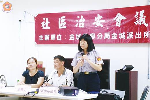 金城鎮泗湖社區發展協會於泗湖社區活動中心召開本年度社區治安會議。透過座談方式傾聽民眾對縣政、治安、交通等多方建言,以即時回應民眾需求及強化各項警政宣導工作。同時也宣導防癌治癌新觀念。金城分局鼓勵社區民眾積極主動參與社區治安工作,以達成「治安社區化、達成零犯罪」的目標,共同維護社區治安。 會議由社區理事長張建灝主持,出席者警察局刑警大隊董紀宏組長、偵查佐許蘭妮、防治科員警莊鎮林、保安科員警許有誌、金城分局第一組組長楊智美、員警曾金塗、金城派出所所長何雪珍、員警董奕晨、張峻豪、黃敬亭、金門縣衛生局、金城消防分隊及社區民眾等約60餘人,場面熱絡。 會中,金城分局第一組組長楊智美呼籲社區居民一同關心家庭暴力問題,並加強家庭暴力及性侵害、性騷擾防治等宣導。而刑警大隊組長董紀宏、偵查佐許蘭妮則就「反詐騙」、「反吸毒、反販毒」進行宣導,針對一般詐騙集團常用的手法進行說明,再三提醒鄉親小心提防,以免被騙傷財。金城消防分隊針對「用電安全」及「防溺作為」加強民眾防範炎熱夏季常發生之災害。 金門縣衛生局陳天順局長親自到場向民眾宣導防癌治癌新觀念,講解癌的生成成長,讓民眾了解早期讓癌化分子逆轉,是可以防止癌細胞形成,而防癌撇步就是早期癌症篩檢(乳房X光攝影檢查、子宮頸抹片檢查、口腔黏膜檢查、糞便潛血檢查),透過篩檢早期發現,存活率九成以上,癌症不等於絕症。