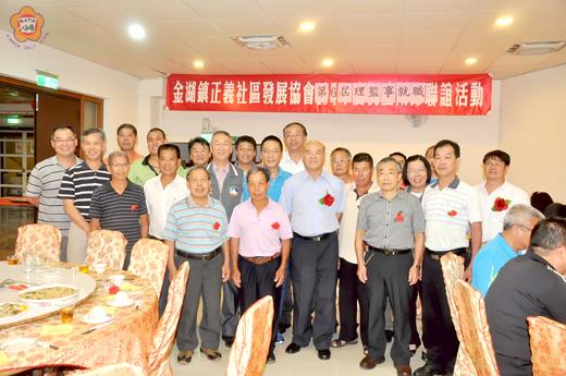 圖文/陳冠霖 正義社區發展協會29日晚間舉辦「第6屆理監事就職」活動,由陳水義接下第6屆理事長,縣府參議許寬、秘書黃秀珍、縣議會副議長謝東龍、立委楊鎮浯辦公室主任孫國智、民進黨金門縣黨部執行長洪海水、縣政顧問陳炳仁等人均到場致意。 正義社區發展協會第6屆理監事包括,理事長陳水義,理事陳水潭、陳長坤、陳進生、陳偃武、陳金城、陳朝水、陳國連、陳應龍、陳金錠、陳森照、陳前龍、陳詩平、陳雲龍、陳舜照。常務監事陳木漳,監事盧榮樑、陳榮棟、陳得興、陳志生。總幹事陳國泰、會計黃天文、出納陳水森。 會中同時表揚第一屆媽媽教室,包括班長陳楊蘇治、副班長李金華、翁玉匣,以及表揚高齡志工陳王麗應女士。