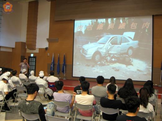 馬路如虎口,交通安全觀念需全面宣導!銘傳大學金門分部舉辦年度交通安全宣導,由金湖分局第一組組長廖建棠蒞校宣導,播放影片實例說明遵守道安規則及路權的重要性,也提供騎乘機車、行人行走的安全觀念,讓該校學生對於交安觀念有所認識。 在銘傳大學金門分部規劃下,金湖分局指派第一組組長廖建棠,前往該校活動中心進行「騎乘機車安全宣導」。因該校學生大部分為馬來西亞僑生、港澳僑生及陸生,對於金門地區之路況及相關交通法令較不熟悉,遂以簡淺易懂的觀念搭配實際案例影片等生動活潑的講解方式,向100多名在場學生進行詳細說明,希望出門在外學子都能平安。 廖組長特別提醒,學生勿無照騎乘機車、勿闖紅燈、勿超速行駛,遇到交岔路口務必停等確認左右無來車再通過,遇有兩段式左轉標誌需兩段式左轉。此外,拆除機車後照鏡及擅自變更車燈顏色是地區常見的違規,依處罰條例可處900元以上1800元以下罰鍰。