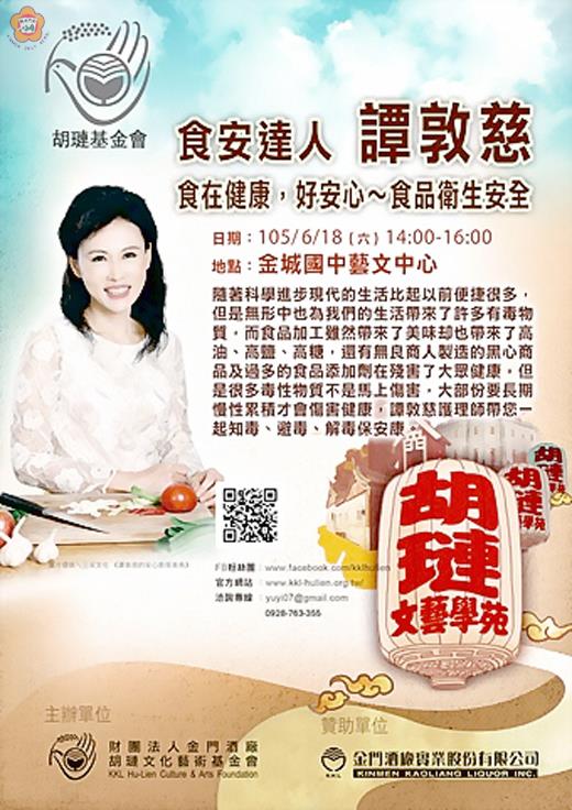 由胡璉基金會所舉辦之文藝學苑,今年度各場講座即將進入尾聲,六月共有三場精彩演講,分別於六月十一日邀請生態鳥人「劉克襄」、六月十二日插畫家「貓王不討喜」,六月十八日食安達人「譚敦慈」護理師,時間為下午二時至四時,地點假金城國中藝文中心,即日起歡迎有興趣民眾上網報名,網址為http://goo.gl/forms/A7Xfk61esL。 由胡璉基金會所舉辦之文藝學苑,場場精彩陣容堅強,活動即將進入尾聲,六月規劃三場演講,分別邀請「生態鳥人-劉克襄」抵金分享「旅行記錄X生態觀察-我的鳥人生活」,新銳插畫家-貓王不討喜,「夢想能吃嗎?創意人的奮鬥之路」及食安達人-譚敦慈護理師,抵金分享「食在健康,好安心食品衛生安全」等主題。其中,六月十一日下午二時將由「生態鳥人劉克襄」率先開講,從事自然觀察、歷史旅行與舊路探勘十餘年。至今出版詩、散文、長篇小說、繪本和攝影作品二十餘部。接續於六月十二日下午二時,由「新銳插畫家-貓王不討喜」到場分享,不僅是Pinkoi亞洲最大設計商品購物網站駐站插畫家、Line原創貼圖設計師,更是2015年新北歡樂耶誕城指定插畫設計師,其為歌手韋禮安操刀設計的《首張同名全創作專輯》,更奪下2011新加坡Freshmusic Awards 最佳專輯設計。 最終場將於六月十八日下午二時登場,將由食安達人「譚敦慈」護理師到場,為民眾解析生活中的許多有毒物質,大部份要長期慢性累積才會傷害健康。譚敦慈護理師將帶領與會民眾一起知毒、避毒、解毒保安康。最終場講座為確保民眾權益並尊重講師智慧財產權,將不開放拍照、錄音、錄影,亦禁止節錄演講內容分享至社群網站等公開平台,敬請大家留意及配合。 胡璉基金會表示,文藝學苑講座已來到尾聲,即日起受理民眾上網報名。講座現場並備有茶點享用,演講陣容堅強,機會難得敬請把握機會報名參與。詳細活動內容可至「財團法人金門酒廠胡璉文化藝術基金會」官方網站(http://www.kkl-hulien.org.tw/ )、臉書粉絲團(https://www.facebook.com/kklhulien )查詢,亦可直接至活動報名網站http://goo.gl/forms/A7Xfk61esL 查詢。