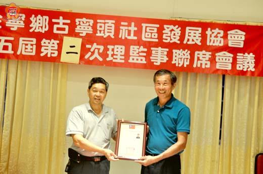 金寧鄉古寧頭社區發展協會昨日舉行第五屆第二次理監事聯席會暨理監事頒證就職儀式,金寧鄉長陳成勇代表陳縣長頒發理事長當選證書,代表會主席陳成泉前往道賀,並針對社區發展需求聽取理監事的意見,也希望在理事長李開陣與理監事幹部的齊心努力下,凝聚社區的向心力,締造優質的社區生活環境。 古寧頭社區發展協會舉行第五屆第二次理監事聯席會暨理監事頒證就職儀式,於廿九日下午六時三十分在海鱻城餐廳舉行,金寧鄉長陳成勇、代表會主席陳成泉前往道賀,受到協會理事長李開陣與理監事的歡迎。儀式由金寧鄉長陳成勇頒發當選證書給新任理事長李開陣,並向他道賀,也肯定第四屆理監事對於社區的付出和貢獻,並就社區發展需求與問題與大家交換意見。 主席陳成泉除向新任理監事祝賀外,也肯定歷屆理監事對於社區的付出和貢獻,讓社區活動辦得有聲有色,一屆比一屆更好。 金寧鄉古寧頭社區發展協會頒證第五屆理監事與會務幹部分別為:理事長李開陣。常務理事:李金鎗、李正騰、李添財、莊素月。理事:李朝金、李俊龍、李錫添、董明城、李錫明、李金溝、李錫銘、李清土、李有財、李振銘。常務監事:李坤洲。監事:莊養財、陳雅蘭、李浩瑋、李俊彥。同時聘請總幹事李琳瑯、副總幹事:李天送、李增鑫。出納李瑞治、會計蔡素芬。