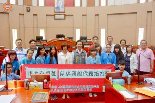 莊煥寧/圖文 由縣府與金門縣兒童少年福利中心與金門縣兒童暨少年關懷協會共同舉辦的「用青春發聲—兒少諮詢代表培力營」學員一行十餘人昨日前往議會參訪,受到議長洪麗萍與議員熱誠歡迎,到會的縣長陳福海也歡迎他們到縣府參觀。 由於正值議會定期會縣政總質詢,參加的學員在議事廳三樓旁聽席見識、學習民主運作,了解地方立法機關組織地位與職權功能,增進民主法治概念。他們並於議會中間休息時間在議場中和議長洪麗萍、縣長陳福海與在場的議員開心合照。