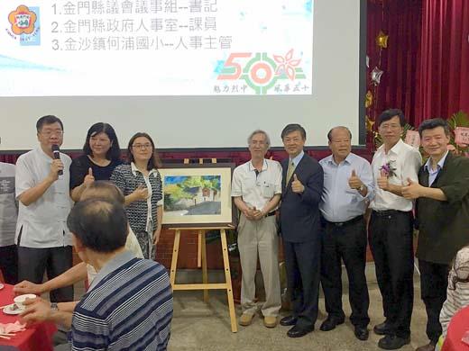 魅力烈中,風華五十。昨晚金門烈嶼國中50周年校慶慶祝餐會,為籌募校友會基金,在金門副縣長林德恭、縣議會秘書長洪允典、金門文化園區管理所所長盧根陣、烈嶼鄉長洪成發、烈嶼國中校長黃明森及校友會長洪燕玉等人見證下,由燕南書院院長楊樹清主持浯島烈嶼知名畫家林世英(藍一峰)捐出的水彩畫作進行拍賣,預估價6萬,最後由家族經營加油站甫開出統一發票特別獎1000萬元的金門縣議員陳玉珍以8萬成交,全場校友歡聲雷動。 魅力烈中,風華五十。金門烈嶼國中創校五十年,遊子、學子紛紛返鄉。昨天校慶活動中,以「典藏‧魅力烈中,風華五十」為校慶主題,推出「未來領袖講座」、「回到少時課程」、「校友美展」、「老照片徵集活動」、「校慶園遊會暨跳蚤市場」、「傑出校友表揚」、「感恩餐會活動」等內容並出版專輯,知性與感性兼具,有回顧,有前瞻,透過多元的訴求、宣傳方式,邀請歷屆校友一起回家,共同見證母校烈中成長歲月。 畫作在校友美展展出,並捐出一幅水彩義賣的烈中校友林世英,以「藍一峰」崛起於藝壇的,1952年生於金門縣烈嶼鄉雙口村,1977年國立藝專美術科畢業,全國中小學美術教師研習結業。1976年創立群英畫室兼教師,1976-1979曾任景文高中美術教師、稻江家職廣告設計科教師、南山商工美工科教師。1979-2007年任職時報周刊美術主編、美術組副主任、美術組主任及印務總監等,服務28年退休。2007年科樂印刷公司專案經理、2008年至今擔任台欣製版印刷公司顧問、及紅藍彩藝印刷公司顧問。1995年隨團參訪夏威夷美術館及重要景點,2002、2005年兩次隨團參訪日本王子OJl及日本NPl製紙過程,也參觀東京京都及熊本文物館,2005年參訪南韓首爾新茂林紙業及博物館。2006年隨團參加上海國際印刷展。作品曾參加中國美術學會、中國美術設計學會、金門縣美術學會等會員聯展及團體性近百次展覽。 林世英曾應烈嶼鄉公所邀請,與好友陳海贊一起回到老家在烈嶼鄉文化館辦理聯合畫展,兩人近五十幅代表作品,筆下蘊藏了豐富的筆墨精神,線條栩栩如生的舞動著。之後應邀在尚義機場大廳藝文空間展出多幅創造自我風格的藝術結晶,呈現文化氣息濃厚的藝術饗宴,今年四月又在金門文化局創作特展,內容有設計、素描、油畫、版畫、粉彩、水彩等六項作品。處處展現創作功力,令人驚豔。