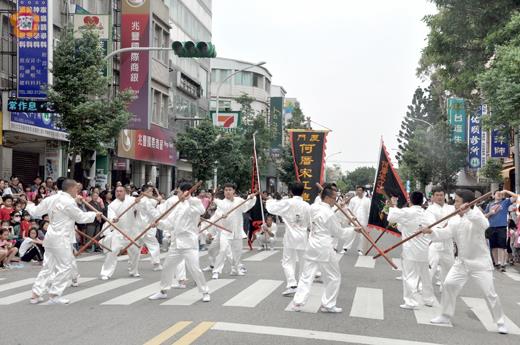 許加泰/圖文 金門迎城隍巡安遶境活動,廈門何厝宋江陣獻藝,熟練的套路與身手功夫,讓觀眾看到套路對打拳頭武功。 宋江陣在傳統農業社會是以干戈衛社稷的社群守護精神的展現,隨著社會形態的轉變,宋江陣已不再是巡守社稷的功能,它成為演繹傳統民俗的方式,用表演結合武術、成為民俗藝陣武術的一環,也是廈門何厝的重要慶典。