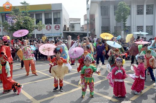 許加泰/圖文 迎城隍巡安活動,公揹婆的特色藝陣,小朋友和大人一起舞動的逗趣畫面,吸引注目,觀看演出,小小公揹婆也是遊行隊伍中的鎂光亮點。金門縣公揹婆民俗協會大、小公揹婆,沿途上的表演,動作滑稽詼諧,尤其小朋友們巧扮古裝公揹婆的逗趣演出,更是吸引許多民眾爭相拍攝。