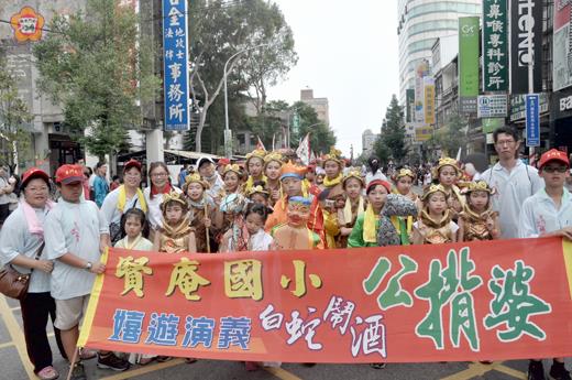 許加泰/圖文 金門迎城隍巡安繞境活動,邀請學校民俗才藝社團及地方傳統藝陣團體配合演出,賢庵國小師生以美猴王為主角人物,戲劇性兼趣味性的演出【嬉遊演義】,增添今年猴年的氣氛。 為配合金門迎城隍慶典活動的教學主題,賢庵國小校長許雪芳帶領一群子弟兵,妝扮孫悟空與猴孫們,身著吉祥的金黃服裝,祈望大家猴年猴塞雷!還有西遊記的主角人物,披著袈裟的唐三藏、穿著露肚裝的豬八戒、以及沙悟淨等人物,上演【壯遊-嬉遊演義】、【白蛇鬧酒】,並以公揹婆特色前後擺動為主要舞蹈動作,輕鬆、活潑、逗趣的表演,引人注目。