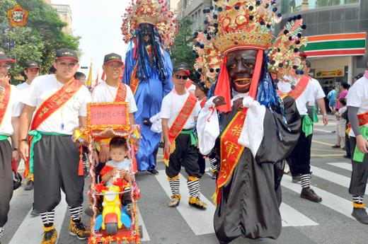 許加泰/圖文 「謝、范將軍」是城隍爺座前兩位護衛部將,東門里民王連壽是「范、謝將軍會」的成員之一,每年的城隍爺巡安活動,和夥伴一起穿虎頭鞋,身著白衣黑褲,紮綁腿,扮演「謝、范將軍」神將,傳承發揚祂們的手足之情及信義精神。 王連壽之子王志政也加入「范、謝將軍會」,昨日,王連壽還特別帶著二歲大的孫子王敦儒一起上街頭,祖孫三代一起參與一年一度的巡安遶境活動。