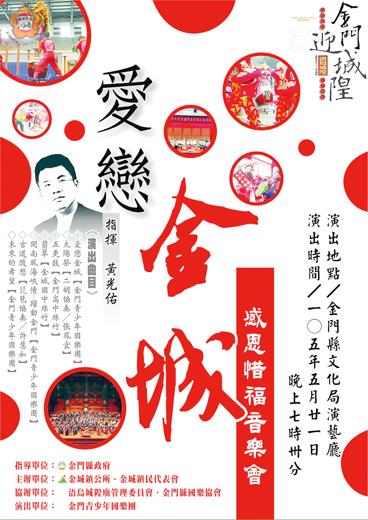 金門四月迎城隍,農曆四月是一個祈福感恩的季節,「二○一六年迎城隍系列活動」,在農曆四月十二日的城隍繞境巡安後歸於平淡,金城鎮公所特別於明(二十一)日的晚間七時三十分,假金門縣文化局演藝廳,舉辦一場「愛戀金城感恩惜福音樂會」,期望透過無國界的音樂饗宴,讓眾人在美妙的音符中,一同感恩城隍爺的護祐,也一同為所有的鄉親祈福;現場還將會有摸彩活動。 明日在文化局登場的「愛戀金城感恩惜福音樂會」,特別邀請到金門青少年國樂團等進行演奏,並由國際知名的指揮家黃光佑老師擔綱指揮,金門國樂團在黃光佑老師的帶領之下,自二○○六年起,就曾多次赴台進行大型的音樂會展演,至今已經培養許多豐富的舞台經驗以及高度專業化的演奏能力,更是廣受樂界的高度肯定。 這場音樂會的演出時間訂於五月二十一日(星期六)的晚間七時三十分起展開,地點在文化局演藝廳,演出曲目包括:《愛戀金城》│金門青少年國樂團、《太陽祭》二胡協奏│張鳳宜、《五更鼓》│金門高中絲竹、《翡翠》│金城國中絲竹、《閩南風海峽情一耀動》│金門青少年國樂團、《古道隨想~琵琶協奏》│許慧如、《未來的希望》│金門青少年國樂團等曲目。 金城鎮公所表示,為了鼓勵鄉親們踴躍到場欣賞音樂會的演出,現場還將會舉辦摸彩活動,將抽出金廈航運、東方之星熱心贊助的金廈小三通來回船票各二十套,以及由台開公司所贊助的金獅影城電影票雙人套票電影券各五十組;摸彩券預計於「晚間七時」開始發送,鎮公所歡迎地區的鄉親好朋友們,能夠闔家大小一同前往聆聽音樂的美好,一同感恩、惜福。 金城鎮長石兆瑉歡迎大家相招欣賞音樂饗宴,他指出,〈愛戀金城〉一曲為金城鎮公所委託作曲家盧亮輝譜寫、創作,曲風展現出古老城鎮濃濃的懷古風情,訴說金門金城地區一帶民俗風情。樂曲第一段以抒情浪漫、充滿情意的旋律表現對金城風景的迷戀和讚賞。第二段以歡欣鼓舞的快速節奏音型,呈現出金城人的豪邁樂觀的性格,以及四月十二迎城隍的迎神歡樂情景。第三段是再呈現了第一段抒情浪漫的主題曲調,並結束在氣勢宏大,象徵金門人無所畏懼、勇往直前的激情樂聲中。 石兆瑉說,金門四月「迎城隍」一直是地區民眾的重要信仰之一,這場虔誠的宗教盛事也在農曆四月十二當日的遶境祈福活動中達到最高潮,這一切都是齊聚眾人之力以及浯島城隍的神威護祐之下,才能造就這數百年來的香火鼎盛;城隍精神「揚善棄惡」,與我們如今所追求的社會公平正義一樣,都是希望能將鄉親的生活帶向更美好的境地,而每年的迎城隍活動,除了可以「看熱鬧」外,最重要的是,透過大家共同的參與,發揚城隍精神,讓社會更祥和。