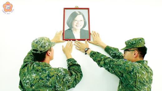 圖文/陳冠霖 新總統蔡英文昨(20)日就職,由於總統為陸海空軍統帥,因此國軍各單位也同步在昨天將前總統馬英九的肖像照片撤下,改換上新總統蔡英文的玉照,金防部轄下各單位也不例外,同步在昨日10:30換照。 金防部少將政戰主任武立文表示,依照憲法第36條,總統統率陸海空軍,各部隊營區中山室、會議室都會懸掛總統照片;依照國防部規定,金防部各部隊、營區於昨日上午,統一掛上蔡英文總統玉照。至於馬英九的照片,必須按照規定上繳保管。
