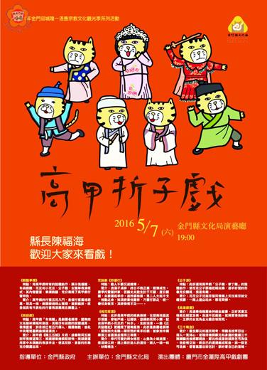 在金門縣文化局邀請下,廈門市金蓮陞高甲劇團一行三十人,將由團長吳晶晶率隊抵金,今晚假文化局演藝廳演出精彩的折子戲,包括南音名曲《班頭爺》及《桃花搭渡》等長期受觀眾喜愛的曲碼;融入現代流行歌曲的荒誕喜劇《妗婆打》將讓你捧腹喝彩;《三千兩金》融入傀儡丑、女丑、拍胸舞等元素,使其更具閩南特色,將呈現高甲戲的傳統藝術精華和魅力,歡迎民眾踴躍到場觀賞。 金門縣文化局表示,配合二○一六金門迎城隍~浯島宗教文化觀光季活動,七日晚間七時起,邀請大陸廈門市金蓮陞高甲劇團於文化局演藝廳演出,廈門市金蓮陞高甲劇團將由團長吳晶晶率領一行三十人抵金進行文化交流,由一級演員陳炳聰、二級演員駱景忠、鄭萍、吳伯祥,加上大型樂隊伴奏,將演出精彩的折子戲,內容包括《群丑爭輝》、《班頭爺》、《妗婆打》、《桃花搭渡》、《公子遊》、《三千兩金》、《吳法殺妻》等曲目。 大陸廈門市金蓮陞高甲劇團,創團於一九三一年,由金門和同安蓮河的藝人重組,各取地名頭一個字,再加上吉利的「陞」字,定名為「金蓮陞戲班」,至一九五三年正式命名為「廈門市金蓮陞高甲劇團」,一九九四年該團作為大陸第一個到金門演出的藝術表演團體,赴金演出一個半月,受到金門鄉親的熱烈歡迎,這也是大陸演藝團在台演出場次最多的劇團之一。而劇團目前陣容整齊,實力雄厚,大批優秀藝術人才脫穎而出,更不乏國家級、華東區、福建省及廈門市舉辦的戲劇會演比賽,省級金牌及中國戲劇表演最高獎項「梅花獎」演員。劇團創作的《金刀會》《上官婉兒》《喬女》《阿搭嫂》《淇水寒》《大稻埕》連續六次在省戲劇會演榮獲桂冠。 金門縣文化局指出,高甲戲是福建五大劇種之一。它始于明末清初,是由閩南農村流行的一種化妝遊行「宋江陣」發展形成的具有獨特風格的閩南地方戲曲劇種,被列為國家第一批非物質文化遺產名錄。此次金蓮陞高甲劇團將抵金演出折子戲,內容精彩可期。包括,《群丑爭輝》的傀儡丑、布袋戲丑、花旦和小花旦、公子丑、女丑等表演程式,其內容豐富,表演詼諧,充分表現了高甲戲行當特色。此次由國家級非遺傳承人陳炳聰、國家二級演員駱景忠、鄭萍、吳伯祥擔綱演出,將讓觀眾欣賞他們精湛的演技外,也領略了高甲戲丑、旦表演精粹。 另外,《班頭爺》《桃花搭渡》《公子遊》劇碼均是劇團長演不衰,深受觀眾喜愛的劇碼。南音名曲《班頭爺》、荒誕喜劇《妗婆打》融入現代流行歌曲,將讓你捧腹喝彩。而《三千兩金》的傀儡丑、破衫丑、女丑、拍胸舞融入角色,也使其更具閩南特色。文化局廣邀鄉親踴躍到場欣賞。