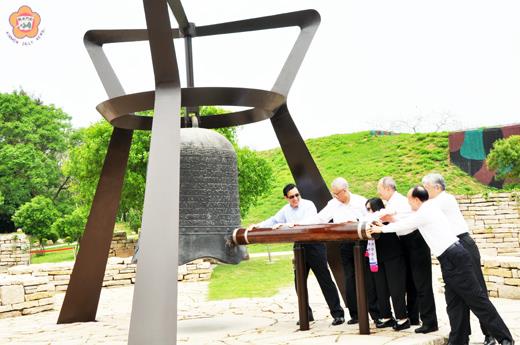 圖文/李增汪 馬英九總統昨(29)日赴金門和平紀念園區出席辜汪會談23週年紀念活動,為「兩岸和平紀念碑」揭碑,彰顯過去8年來兩岸和平發展的重要成果。 馬總統隨後並偕同吳副總統、辜嚴倬雲女士、辜成允先生、夏立言主委及林中森董事長等人共同敲響和平鐘,全體人員並合影留念。