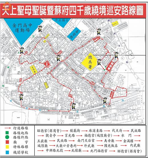 「2016金門迎城隍—浯島宗教文化觀光季—天上聖母暨蘇府四王爺平安遶境」將於今(26)日下午2時起在金城鎮舉行,金門縣警察局金城分局為維護周邊車流順暢與遶境隊伍的交通秩序,將於金城鎮市區道路實施局部交通管制(如圖),並視交通狀況提早或延後管制,請用路人及前往參與遶境活動民眾,配合各項交通疏導管制措施,以維護道路行車順暢及人車安全。 金城分局指出,有關天上聖母暨蘇府四王爺平安遶境活動周邊道路交通管制措施如下: 交通管制時間為今(26)日下午1時起至活動結束止(預計下午5時),管制區域為金城鎮市區民族路、民權路、民生路等所圍繞市區道路,並視各路段、區域交通狀況許可情形下,採彈性開放通行,以確保交通順暢。 屆時參與遶境活動民眾之車輛在各路口行車動線如下:(一)禁止車輛進入中興路、珠浦北路、莒光路、光前路之市區中心。(二)民生路沿線禁止停車。(三)車輛請停放金城鎮公所後方、金城分局旁停車場、浯江北堤路停車場。 而救護車、消防車、執行公務車輛,一律通行。 金城分局分局長吳山連呼籲前往參與民眾及行經該路段駕駛人配合勤務人員之指揮疏導,避免造成活動區域周邊道路車流延滯及耽誤行車時間,儘量避開活動區域範圍,共同維護交通安全秩序與順暢。