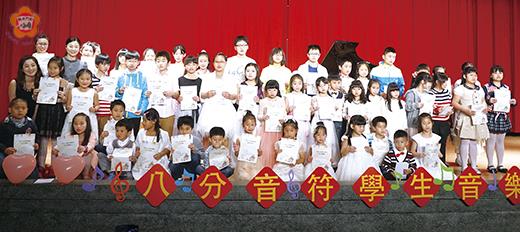 八分音符音樂坊連續兩年假金門高中白宮舉辦學生發表會,幼兒園到高一共六十位學生演譯古典鋼琴名曲、流行歌曲、電影主題、動畫主題歌等,透過不同的組合方式和樂器,勇敢站上舞台完成演奏,也為彼此開啟美好的分享交流機會,為期三小時時間,雙手滑過黑白琴鍵譜出動人樂音,親子、民眾共享一場溫馨又有觀賞水準的音樂饗宴。 該場音樂會由八分音符音樂坊負責人徐元婕以及妹妹徐元妤,以四手聯彈示範下展開,常於全縣鋼琴比賽榮獲殊榮的紀有容率先登場表演蕭邦的《小狗圓舞曲》,中間安排三組姐妹檔和兄弟檔鋼琴四手聯彈演出,展現彼此間熟悉的默契和彈奏技巧,六十位學生輪番上台詮釋選定的歌曲,內容從古典鋼琴曲,到五月天的《勇敢》、《擁抱》等流行歌曲,以及電影主題曲《小幸運》甚至動畫大師宮崎駿的電影主題曲,內容豐富多彩,讓人聽得如痴如醉,最後在小學三年級學生周羿的爵士鼓演奏五月天的《星空》中,用輕快的節奏為音樂會畫下圓滿的句點。 二度假金門高中白宮,為學子開闢表演舞台的徐元婕指出,音樂是父母送給孩子最好的禮物,即使以後不是就讀音樂相關科系,音樂卻是陪伴自己一輩子的好朋友。學子練習認真,勇敢踏上舞台完成曲目,過程難免緊張,鼓勵大家持續努力、勤練習,建立信心,享受音樂、分享音樂,翱遊在美妙的音樂世界裡。 參與演出的五年級學生許恩瑞說,謝謝父母讓她學鋼琴。四年級的林品彤也表示,在我的心中,音樂就像是我的好朋友,陪在身旁訴說心事,帶給我無限快樂。而一年級的李詠祺則認為,剛開始覺得學鋼琴很辛苦,因為每天都要練習,經過參加比賽和表演增加了自信心,也更喜愛音樂了。就讀六年級的范栩潔說:吹長笛可以讓我放鬆心情,雖然一開始學時很辛苦,但因為持續不放棄的練習已經能吹出美妙的音樂。七年級的方均豪表示,學樂過程,從不會到會的階段是需要很多耐心,很高興能學會很多曲子,讓人感到很有成就感。同年級的謝菀軒則說:音樂能讓我放鬆心情、紓解壓力,現在也能輕鬆彈出流行歌曲,自彈自娛,音樂已成為我生活中的一部份。而幼兒園中班的許書愷也說:彈鋼琴很好玩,無聊的時候喜歡彈琴,希望我的鋼琴能彈得越來越好。 整場音樂會,是學琴孩子的表演舞台,除了為自己彈也欣賞同行的表演,相互切磋。三小時時間與會親子無人離場,當彼此最佳的觀眾,透過觀摩檢視自我訓練成果,學習他人優點,了解不足之處也激勵自己更加努力,場面即溫馨又具觀賞水準,所有人共譜一場多彩的音樂饗宴。此次音樂會圓滿落幕,將放眼年底的全縣鋼琴比賽,徐元婕做以上表示。 最後,八分音符音樂坊也為每位參加演出的同學們製作了精美的紀念狀與準備手工麵包餐盒,在溫馨與充滿美妙樂音的旋律中圓滿結束並相約明年四月學生發表會中再次登台共譜佳音。