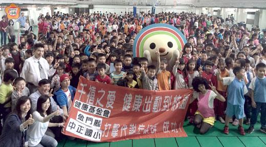 千禧之愛健康基金會,帶著超高人氣的OPEN小將,到中正國小執行「健康出動到校園」任務。會中,透過營養小學堂、行動劇、甩油互動體驗等,宣導代謝症候群防治觀念。OPEN小將現身學子HIGH到不行。除了帶動跳甩油操,也登高一呼籲學童擔任健康糾察隊,將健康觀念帶回家推及親朋好友,一起為自己的健康把關。 長期致力於推動代謝症候群防治的千禧之愛健康基金會,今年首次跨海到離島宣導代謝症候群防治,並現身中正國小活動中心,帶動師生跳甩油操、甩油互動體驗等,讓小朋友為之瘋狂。超高人氣的OPEN小將告訴小學生,拒糖、甩油、吃全穀,學當腰圍糾察隊,喚起父母健康意識。 教育處處長李文良、中正國小校長張樾、千禧之愛健康基金會執行長陳欣勵、中正國小師生齊聚一堂學習「抱、拉、量」等正確量腰圍的口訣,並由中正小學童也上台為教育處長、校長和老師們量腰圍,並替全校學生做示範。基金會也透過OPEN小將、每太飽家庭劇團的演出帶師生認識代謝症候群的健康風險,並傳遞男性腰圍小於90公分、女性小於80公分的健康標準值,控制腰圍與三高、選擇健康飲食及維持運動等正確預防代謝症候群觀念。基金會也發送「打擊每太飽腰圍糾察隊教材包」、千禧健康OPEN小將的趣味漫畫及闖關遊戲設計的學生手冊,加深學童對健康生活型態的認識。 金門的學生非常幸福,由縣政府全面供應幼兒園至高中生免費營養午餐及鮮乳,校園飲食在營養師設計之下,熱量及飲食均衡度皆獲得良好管理。但學童在校園外的飲食行為卻難以掌控,故教育處處長李文良昨表示,除了需加強學生的校外飲食認知之外,也呼籲家長應扮演重要角色。 千禧之愛健康基金會,推動「健康出動到校園」活動今年邁入第五年,走過全台十八縣市三十七所國小發現,含糖飲料及油炸食物攝取過量是學童健康的一大問題。為強化學童對健康餐點的認識,透過寓教於樂的遊戲設計,OPEN小將親密合照機會,讓學童更加了解挑選健康營養食物的原則,深化至平日餐點的選擇。 為此,教育處處長李文良也指出,學生若能重視平時飲食,多選擇健康食材,對代謝症候群防治很有幫助。教育處自前年起於學童營養午餐推動糙米,建議老師及學童多攝取全穀類,不僅因膳食纖維、維生素B群及礦物質含量比白米高。除了保持少吃含糖、油炸等高熱量食物外,更要多做運動,才能避免腰部脂肪囤積或代謝症候群等慢性疾病找上門。