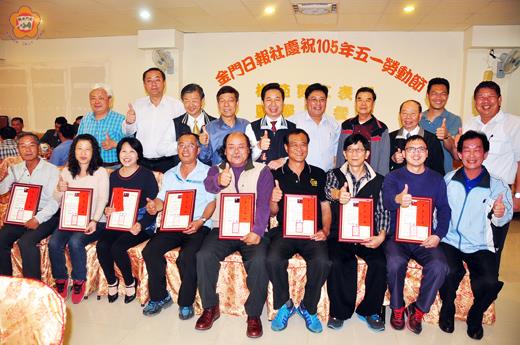 金門日報為慶祝五一勞動節,昨(27)日中午於金湖地區舉辦餐敘,並同時表揚本報模範勞工,包括許燕山、陳曉琳、王根圍、蔡群生、楊水詠、黃森隆、陳有映、陳麗明、陳志生共9位,均頒授獎狀。 本報昨日舉辦「105年五一勞動節慶祝大會暨模範勞工表揚」活動,包括縣長陳福海、副縣長林德恭、福建省政府秘書長李智雄、縣議會副議長謝東龍、縣議員蔡水游、李應文、陳滄江等多位貴賓均到場祝賀,場面熱鬧盛大。 縣長陳福海親自到場致詞,陳縣長說,金門的鄉親每一天早上如果沒有看金門日報,「就感覺好像缺少了什麼」,金門日報和所有金門鄉親的生活是息息相關、緊密連結,金門日報也扮演很重要的政令宣導角色,因此與整個金門社會脈動環環相扣。陳縣長也勉勵包括報社記者、編輯、校對、印刷同仁等所有報社員工「辛苦了」。