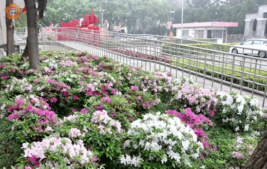 圖文/楊水詠 金門縣政府位於全島首善之區,每天上班時間到縣府洽公民眾不少,走入縣府大門牌樓後,迎接的是兩排綠籬,綠意盎然!來到縣府大門前,左右兩側園圃種植杜鵑花,繼縣府櫻花盛開之後,縣府杜鵑花隨之綻放登場,有粉紅色、白色、紫紅色相間,花團錦簇,朵朵盛開迎人,洋溢著無限的春意和景緻!