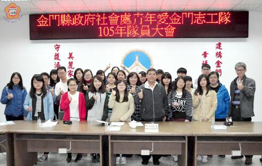 「青年志工愛金門,讚!」金門縣政府社會處青年愛金門志工隊105年隊員大會會議昨日假縣府大禮堂舉行,青年志工冒著濃霧及春雨出席參加,展現青年熱愛志願服務和愛金門的決心和精神。縣府社會處長甯國平表示,青年參與志工服務,是關懷社會的第一步,希望往後在承辦人員協助之下,還有在青年志工成員有規劃的參與,成為青年走入社會的起步基礎! 縣府社會處青年愛金門志工隊從剛開始,成員數僅有十幾位;至目前為止,青年愛金門志工隊成員已有五十餘位,可說成長非常快!甯國平指出,自今年開始舉辦大專青年關懷社會活動,相信透過參與青年志工服務也是一種自我修身、且對自己很有幫助。 在志工隊大會業務報告指出,為活躍本縣志願服務風氣,並培養青年、學生的服務能方,以及學習助人利他的態度與價值觀,並以實際行動關懷和服務社會。青年愛金門志工隊於去(104)年三月起,進行組織調整、志工招募和活動辦理等工作事宜,俾協助本縣志願服務推廣中心業務之推動。 為符合志工大隊服務精神及宗旨,於去年四月中旬經隊員大會決議更名「青年愛金門志工隊」,陸續辦理四次聯繫會議,加入青年志工人數已達五十餘人。目前,青年愛金門志工隊領有紀錄手冊者達三十人,服務時數達二千餘小時(含臨時支援志工時數),績效亮麗。 去年一年中,青年愛金門志工隊透過辦理「快樂玩英文~兒童育樂營」、「青年讚出來‧快樂擁抱愛金門~志工體驗營」等活動,從中運用青年專業及做中學等方式,培養青年服務能力,並由本縣志願服務推廣中心結合政府、學校、社區、傳播媒體等各項資源,讓活動更加臻善臻美,更看見青年志工熱情、活力及創意的一面,以及青年懷家鄉的決心和服務社會的毅力。 青年愛金門志工隊召募對象只要年滿十五至三十五歲,男女不拘,具有服務熱忱之青年,得以申請加入成為正式及儲備志工。未領有志願服務紀錄冊者,須按志工隊儲備志工管理辦法,於一年內完成志工基礎及社政特殊訓練,並取得規定時數及志願服務紀錄冊者,經審核及會議決議通過,方為正式志工,得以享有正式志工之福利。 另,青年愛金門志工隊釐定有志工之獎勵,一是志願服務滿一年,服務時數達一百小時以上者,得向運用單位申請認證服務績效,以及發給志願服務績效證明書。二是協助志工申請志願服務獎勵暨榮譽卡之申請,以及相關單位獎勵事項。 未來,青年愛金門志工隊將配合本縣志願服務推廣中心業務,以「服務金門、紮根金門、愛金門」的服務精神下鄉服務,用青年志工的活動與創意來活絡、營造社區,並散播志願服務種子;而且,積極關懷、服務本縣兒童、青少年、身心障礙者、婦女及老人等族群。 此外,社會處青年愛金門志工隊大會也審核通過青年愛金門志工隊105年度志願服務計畫,主要為協助本縣志願服務業務推動及提升民間團體拓展各項社會福利服務工作,共同為社會之祥和貢獻心力,並為本縣帶來志願服務風氣。