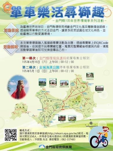 為推廣世界地球日並落實環境教育,金門縣環保局結合民間團體單車安全協會、風火輪單車協會共同舉辦兩梯次「單車樂活尋獅趣」系列活動,將於4月16日、5月1日上午登場,活動已開始受理報名,每梯次限定150人,歡迎有興趣的民眾與單車好手踴躍參加! 環保局指出,活動報名方式採網路報名,每梯次150個名額,請至「環境教育終身學習網」(http://elearn.epa.gov.tw/)註冊帳號後,於課程資訊點選「福建省金門縣」進行報名。全程參與活動者均可獲4小時環境教育學習時數。 環保局表示,第一梯次於4月16日上午8時假環保局前廣場集合報到,活動將於8時30分正式出發,活動規劃騎乘路線如下:環保公園→環島南路→瓊義路→環島北路→蘭洋路→吾愛吾村拱門→環海自行車道→田墩海堤→西園路→西園鹽場地方文化館(休息點1)→沙青路→光華路→陽沙路→山后民俗文化村(休息點2) →楓香林→陽翟老街(休息點3) →高陽路→環島北路→瓊義路→環島南路→環保公園(終點)。 第二梯次於5月1日上午8時假金城海濱公園停車場廣場集合報到,活動將於8時30分正式出發,活動規劃騎乘路線如下:金城海濱公園→石雕公園→延平郡王祠→西海路→珠水路→明遺老街→官路邊百年七里香→吳厝百年榕樹→珠山聚落(休息點1) →翟山坑道→環海自行車道→歐厝聚落→后湖海濱公園→后湖百年雞蛋花→環島南路→盤果路→伯玉路→中山林遊客中心(休息點2)→雙瓊路→瓊安路→頂林路→雙鯉濕地(休息點3)→慈湖→同安渡頭自行車道→金城海濱公園 (終點)。 本次單車環島融入風獅爺尋寶活動為主題,環保局說,活動開始前每人可獲得一張當日活動尋寶單,詳細內容採掃描QR Code方式呈現,依掃描後獲得之內容進行尋寶活動,參加人員須依序尋找所有藏寶位置,並蒐集各關卡提供的資訊,於活動結束後根據所蒐集到的資料,填寫活動學習單後即可兌換宣導品乙份。 活動參加者請自備自行車及安全帽(未戴安全帽者謝絕參加),為響應環保請務必自行攜帶水壺,主辦單位將於休息點準備桶裝水供民眾飲用,並穿著車衣或運動服、防風鏡、毛巾等,並攜帶健保卡、個人藥品及輕便雨衣。活動聯絡人請洽:洪銘駿先生,082-337483。