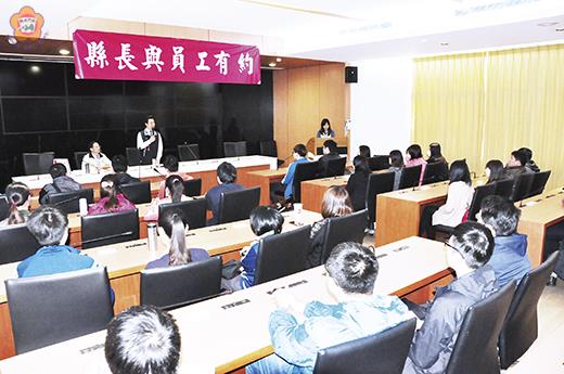 縣長與員工有約!金門縣長陳福海昨天與來自府外九個二級單位、六十餘位新進人員座談,並逐一唱名詢問工作概況、有沒有需要協助?在工作上有沒有人教導?適不適應等等的問題。陳縣長表示,在一個單位和工作要適才適所,然後樂在工作,並把工作當做學習、交流;同時,他希望每一位新進人員都要以自己服務的單位為榮,在自己工作崗位上產生服務價值。 這場縣長與員工有約~新進人員座談會於昨日下午四時舉行,陳縣長講述從政歷練,他做縣長是對金門的一個夢;陳縣長說,金門是個好地方,也是幸福島嶼,他並告訴新進人員「基本上希望金門會更好!但需要整個縣府團隊一起來做!」 在座談中,參加單位有港務處、養工所、防疫所、農試所、水試所和畜試所、殯葬所、文化園區管理所、體育場的新進人員;陳縣長逐一唱名,聽聽每位新進人員在單位上、工作上的疑問和想了解問題,他說都可以提出來,並問說有遇到什麼問題?同時,陳縣長特別歡迎新進人員到金門縣政府,發揮一顆小螺絲釘的力量和精神,幫金門做事。 陳縣長也把他的手機電話、LINE,告訴新進人員,有何需要幫忙和建議,都可隨時告訴他,不要客氣!若是有問題和盲點,也可以找他。 陳縣長說要以樂在工作的態度為金門做事,所做的每一件事對金門都有正面幫助。陳縣長表示,去年談「正心正念」,今年則提「慈悲、智慧」,陳縣長說慈悲沒有敵人,以同理心和站在對方的立場去思考,很多事情都可以解決;智慧沒有煩惱,請傾聽請教一些不同的想法意見,吸收更好知識,幫我們的鄉親、幫這塊土地做事,煩惱也會減輕。 陳縣長指出,在擔任立法委員四年任內,以人為依歸,每年過年都把鄉親送回金門,最後一個回到金門與家長吃年夜飯的人;尤以有在立法院的歷練,這兩年年節疏運無論加班機、軍機,都全力來投入,讓鄉親返家過一個佳節。 陳縣長說,希望年輕人在金門有更好的工作,也可以在金門創業,經營一些文創產品和有特色的產品;而且,政府也會打造一個平台和給一些誘因外,並給低率貸款創業。目前,在縣府這個職位是在學習,了解行政部門在做什麼事?而且年輕人想做什麼,會有很多創意,把金門行銷出去,讓更多人知道金門的故事,更多的人喜歡金門! 最後,陳縣長提醒說,在工作上注意安全很重要,並鼓勵大家去學習和考專業證照,不管在政府單位或是到外面企業單位都有加分作用和效果。