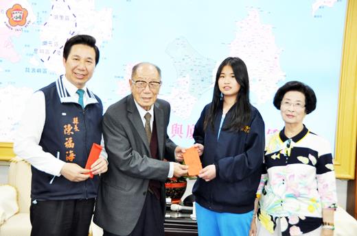 旅台鄉親楊水應長期熱心公益和關心家鄉教育,並經常回饋金門家鄉,昨日下午他在前縣長李炷烽陪同下拜會了縣長陳福海,陳縣長並致贈感謝狀予楊水應夫婦,感謝他們長期以來捐助獎學金,關心地方教育事業,照顧清寒學子不遺餘力。 104學年度第2學期楊水應紀念雙親獎助學金頒獎典禮,昨日下午三時三十分於縣長室舉行。並由楊水應夫婦頒發獎助學金予獲獎學生和代領家長。前縣長李炷烽、縣府教育處長李文良在場作陪。 楊水應係在民國四十七年赴台工作,經商有成,先後設立了鴻安紡織廠、鴻嘉貿易公司、隆安布行及鴻瑄化學皮廠等公司,其長年投入公益事業,平常樂善好施,對於家鄉事和弱勢、急難者之救助從不落人後,不但捐款成立紀念雙親楊篤江、張含英獎助學金,也設有急難救助金。他貢獻社會投身公益的表現深受肯定,於民國七十七年獲選全國好人好事代表,八十四年還獲頒「企業成就獎」。 縣長陳福海對於高齡九十多歲的楊水應,經商有成不忘回饋鄉里,且對於家鄉的教育文化竭盡心力,認為精神值得大家效法學習,並鼓勵獲獎學生要認真讀書,將來事業有成也不忘要回饋家鄉。同時強調,會把這份愛傳承延續下去,並希望他們經常回家鄉走走、看看。 為紀念雙親撫育之恩並鼓勵經濟弱勢學生努力向上精神,楊水應在民國70多年捐款成立紀念雙親楊篤江、張含英獎助學金,由縣府教育處每學期核發縣籍高中職學生獎助學金。民國84年擴大到公私立大學院校研究所、大專院校生、高中、高職,日夜間部金門籍經濟弱勢子女獎助學金。 他並設立「湖峰楊氏獎學金」及長期捐助金門家庭扶助中心、大同之家、旅台金門同鄉會等,善行義舉,深獲鄉親敬佩及稱讚。 楊水應夫婦和兒子7日搭機返回金門祭祖,並特地撥出行程親自與受獎學生見面。今年楊水應雙親紀念獎助學金共14名申請,經審核共12人通過,包括公私立大學5名,公私立專科1名,高中職各3名,每人獎助金額新臺幣4,000元到1萬元不等。楊水應先生逐一頒發獎助學金,並鼓勵學子能持續認真學習,未來有能力也能回報社會。 而他昨日也關懷大同之家老人和小孩,給一百三十位老人和小孩每人六百元禮金紅包,也受到陳縣長和大同之家代表的感謝。