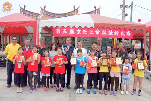 金寧鄉盤山村廣濟廟管理委員會慶賀玄天上帝駐駕500周年聖誕千秋,從昨日起一連三天舉行慶典活動,首日並結合盤山扯鈴民俗運動推展協會共同辦理第五屆「玄天上帝」盃扯鈴比賽,今、明兩天舉行建醮慶典,十日下午迎請玄天上帝諸神明繞境巡安盤山各角落,來護佑境內平安。 廣濟廟管理委員會主任委員翁文奧指出,今年適逢玄天上帝駐駕廣濟廟500周年,地方鄉親迎「玄天上帝」的聖誕,熱鬧舉辦三天的慶典活動,並在該境鄉紳及善信熱情襄贊下,特別邀請來自台灣高雄的尚和歌仔戲團連續演出三天的戲碼酬神。 翁文奧表示,該廟管委會配合廟慶辦理「玄天上帝」盃扯鈴比賽,今年邁入第五屆,提供學生表演的舞台機會,也增加廟慶的慶典氣氛。 金寧鄉長陳成勇、鄉代會副主席李開陣、鄉代表李正騰到廣濟廟上香敬祭,也和金鼎國小校長蔡雪芳、廣濟廟管理委員會幹部一起欣賞學生的扯鈴演出。 第五屆「玄天上帝盃」扯鈴比賽成績,初級組:第一名,金鼎國小林湘穎、陳宛妮。第二名,金鼎國小翁苡晴、翁瑋彤。第三名,金鼎國小余家穎、翁靖淳。第四名,金鼎國小許芷綺、翁子晴。第五名,金鼎國小莊心語、陳品言。公開組:第一名,金寧中小學翁雨軒、翁 毓。第二名,金鼎國小翁敏恩、陳品妤。第三名,金寧中小學翁靖雯、翁翊純。第四名,金門高中李宜蓁、金寧中小學翁芷芸。第五名,金寧中小學翁 芷、翁梓雲。
