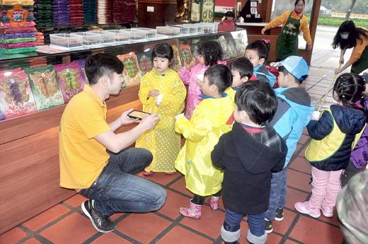 柏村附幼的小朋友們23日上午戶外教學,參觀「陳金福號」貢糖專賣店和「馬家麵線」,小朋友不僅聽取店員解說貢糖和麵線是如何製成的,也親口品嘗貢糖和麵線,吃得津津有味。柏村國小校長陳為學表示,透過戶外教學能夠讓小朋友真正「實地體驗」,讓小朋友到現場去看,了解金門在地特色。 柏村國小附設幼兒園舉辦戶外教學,由校長陳為學以及幼兒園老師和幾位家長,帶著幼兒園小中大班的小朋友,一共34人搭乘遊覽車從柏村國小出發,來到位於伯玉路上的「陳金福號」貢糖專賣店以及「馬家麵線」參觀。 雖然昨天早上天氣不好,天空飄著毛毛細雨,但還是不減小朋友出遊的興致,每個小朋友穿著統一的外套、背著背包、戴著帽子、穿著雨衣,在老師的指揮之下,下了遊覽車乖乖排好隊,第一站抵達「陳金福號」貢糖專賣店,由於老闆陳金福有事外出,由其兒子同時也是陳金福號執行長陳孝瑜親自出面接待,首先先播放陳金福號的企業簡報影片給小朋友看,影片中介紹陳金福號的創立過程,以及貢糖製作方式,小朋友們每個聚精會神看著影片;播放完畢後,由執行長陳孝瑜補充講解,並且針對剛剛影片內容提出問題,讓小朋友搶答,認真看影片的小朋友搶先舉手回答問題,獲得小小獎品;校長陳為學也補充說明,「陳金福號」的「號」就是「商號」的意思。 看完了企業簡介後,執行長陳孝瑜帶著小朋友們來到販售部大廳,原本打算實地參觀師傅製作貢糖的過程,但由於店家機器出了點問題,暫時無法參觀,因此陳孝瑜又播了另一段當年店家接受東森電視「台灣1001個故事」專題採訪的影片,讓師生們看,小朋友從影片中也可以看到製作貢糖的過程,達到相同效果,小朋友甚至看到身邊陳孝瑜出現在影片中受訪,對於身邊的大哥哥出現在電視裡,小朋友覺得很奇妙,又驚又喜。 看完兩段不同內容的簡介影片後,陳孝瑜也邀請師生試吃店內多達16種口味的貢糖產品,小朋友們排隊試吃,一種口味接著一種口味,吃到停不下來,每個人都吃得笑容滿面,店家也考慮到貢糖可能太乾,貼心準備熱飲讓師生們配貢糖吃;大夥參觀完畢要離開時,陳孝瑜還準備一人一小包貢糖送給師生,小朋友們有得吃又有得拿,大家開心得向陳孝瑜說謝謝。 參觀「陳金福號」結束後,一行人上了遊覽車前往不遠處的第二站「馬家麵線」,一進店內便有多位阿姨叔叔店員熱情招呼小朋友,並且由其中一位阿姨負責解說,正巧她的小孩也在念柏村國小,感覺格外親切。店員阿姨詳細解說古早製麵線的機器給小朋友看,並介紹掛在店內的真實麵線,讓小朋友排隊一個一個摸摸看剛製成、還沒包裝起來的麵線半成品,小朋友看到自己平常吃的麵線原來是長這樣,覺得很新奇;店員也介紹店內紅高粱和白高粱給小朋友看,並解說哪一種較適合用來製作麵線。 解說完畢後,同樣由店員阿姨提出問題,讓小朋友搶答,答對的也有禮物,獲得一小包麵線,許多小朋友踴躍搶答,拿到禮物心滿意足。時間接近中午時分,小朋友飢腸轆轆,「馬家麵線」員工貼心地早就煮好一大鍋麵線準備要給小朋友吃,小朋友們從背包裡拿出事先準備好的碗筷,十分有環保概念,一個一個排隊讓店員盛裝麵線到碗裡面,再淋上一匙店內販賣的蠔油沾醬,瞬間香氣四溢,小朋友個個狼吞虎嚥,沒三兩下就把整碗麵線吃光了,甚至有的小朋友還想再吃一碗,不過老師擔心吃太多麵線中午回學校吃不下營養午餐而作罷,可見麵線對小朋友的吸引力有多大。