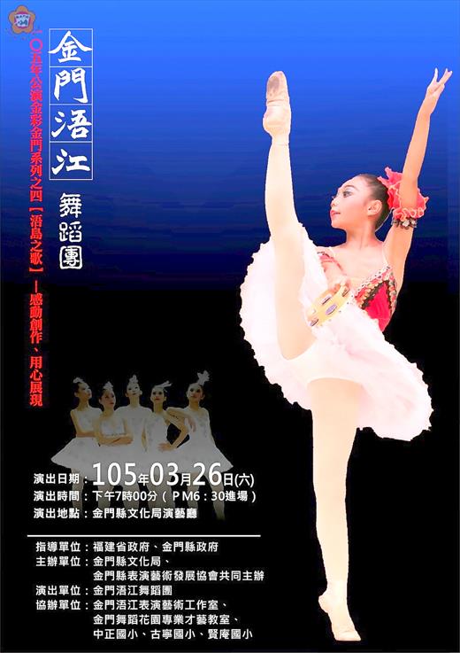 金門浯江舞蹈團年度舞蹈公演│金彩金門系列之四「浯島之歌」,訂於三月二十六日晚間七時起,假文化局演藝廳登場,由舞團藝術總監張慧羚,邀台灣多位精銳編舞家張尹欣、李玉仙、謝佩珊、林瑄瑄等共同完成此次跨領域舞蹈劇場作品,共廿一首舞碼,內容精彩可期,歡迎民眾踴躍到場欣賞。 金門浯江舞蹈團金彩金門系列之四「浯島之歌」舞蹈盛會,由金門縣文化局、金門縣表演藝術發展協會、金門浯江舞蹈團共同主辦,金門浯江舞蹈團所策劃執行,內容將多年來團員肢體表達及情感傳達能力訓練,以及赴台參賽的佳績,以創作的跨領域舞蹈劇場模式,加上多位精銳編舞家的創作,將於三月二十六日晚間七時起,假文化局演藝廳一次呈現給鄉親。 「浯島之歌」舞蹈公演,三月二十六日晚間七時登場,六時三十分入場,表演內容排定有,「情迷Tango」、「正月鬧元宵」、「芭蕾之芽」、「遇見‧雪精靈」、「一閃‧一閃‧亮晶晶」、「田嬰嬉遊趣」、「西遊記‧美猴王」、「花開花落」、「捍旗勝令武威揚」、「快樂舞兔蹤」、「追朔」、「Cat's」、「浯島‧中秋‧搏餅樂」、「逐夢的女孩」、「小小茉莉」、「Robot」、「祈」、「蒙古小騎手」、「蒼穹少年」、「So you play」、「激楚」等共廿一首動人的舞作,喜歡舞蹈你千萬別錯過。