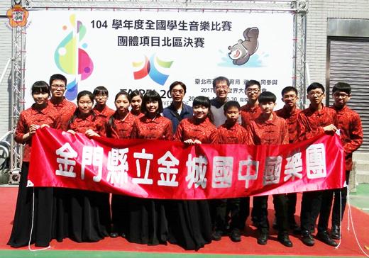 金城國中國樂絲竹團,三月七日於北市南門國中音樂廳,參加一○四學年度全國學生音樂比賽北區決賽,絲竹室內樂合奏│國中團體A組,以九十一點八成績榮獲該組特優第二名。 金城國中國樂絲竹團,由許文濤、盧宜庭、黃瀚德、許博淞、陳薇、薛擎、王彥博、王鼎緒、顏佳萱、王祉茜、許芝寧、陳慶寧、何易蓁、許文璟、辛祥瑋等十五人代表,赴台參加一○四學生度全國學生音樂比賽北區決賽,在絲竹室內樂合奏-國中團體A組,以九十一點八成績榮獲特優第二名。 金城國中表示,金城國中國樂絲竹團由蔡志強老師和國樂團後援會會長高靜雪率隊赴台,三月七日假台北市南門國中音樂廳出賽,演奏指定曲「相聚歡」和自選曲「翡翠」二首曲目,學子經過長時間集訓和練習,相當辛苦表現也相當精彩,並以高分贏得佳績。