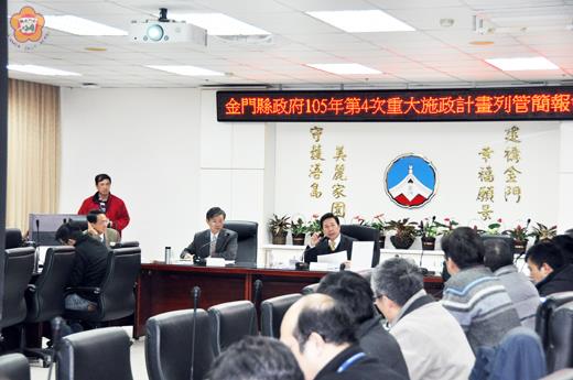 縣長陳福海主持第四次重大施政計畫列管簡報會議,強調重大公共工程推動,自己以「正心正念」來抓政策面,也相信專業,但業管部門對工程招標應嚴謹面對,不容有外力干預。而金門港水頭客運中心新建工程案,只許成功,不容任何閃失,因此,港務處要密切管控,做到每個環節相扣。 陳縣長也強調,對重大施政計畫列管,處長要做對接,並加快速度來推動。 會議在縣政府召開,由縣長陳福海主持,副縣長林德恭及參議翁自保、處局主管、自來水廠等代表與會。 會中,針對列管案件進行逐一檢視:一、金門港水頭客運中心新建工程案。二、住宅政策案(尚義、慈湖、安岐閩南建築專用區)。三、金門自大陸引水案。四、金城鎮停車場案。五、行政園區案。 對於住宅政策案,縣長陳福海認為尚義住宅辦理第一期經濟住宅及社會住宅統包公展及招標作業,應儘量加快速度。至於慈湖住宅案請建設處趕快定調;而安岐閩南建築專用區要加快速度推動,業管部門並要做全管控和追蹤。 有關金門自大陸引水案,縣長陳福海希望自來水廠對於輸水管線工程施作,只要看到問題就要馬上報告,一些攸關中央協調事項,也可請立委做橫向協調聯繫。水的預算也要精算出來,不該地方出錢的也要弄清楚,以利向中央爭取,且每個環節要相扣做好。 至於金城鎮停車場案,也請觀光處提政策小組討論,做最後定調。而金門縣行政園區規劃案,有關計畫道路及爭取中央預算補助、園區量體等,許多想法一併請規劃單位思考融入。 港務處指出,金門港水頭客運中心新建工程案,有關規劃設計採限制性招標(公告閱覽);規劃設計預定於105年3月8日召開競圖招標說明會,地點在台北福華文教會館;金門場說明會則於105年3月18日在水頭旅客服務中心501會議室辦理。 金門縣自來水廠指出,大陸引水工程計畫,有關海管工程及陸上設施方面,係自丙洲到田埔規劃的海底管線長度約十六公里,局部海域最深深度約二十五公尺,海管及陸上管管徑均採八十公分,上岸後將晉江原水導入田埔水庫西北側新建受水池,受水池蓄水量約有十四萬噸,之後再經八公里導水管輸送到洋山淨水場處理使用,藉由供水系統將處理後清水送至全金門島。 自來水廠指出,海管施工規劃將由晉江往金門佈設,下半年先進行陸側之海管施作,明年四月開始進行我方海域之海管佈設,整體工程工期預計於106年9月底完成。