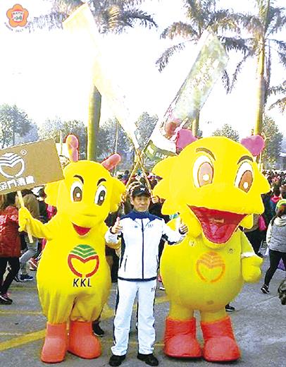 李金鎗/圖文 一年一度的金門國際馬拉松賽事已於2016年2月28日(週日)在金門大學盛大圓滿舉行完畢。金門酒廠除了積極回饋社會,連續9年來大力贊助金門馬拉松賽事,在參與健康運動上更是熱情踴躍,本年度的參與人數更勝去年! 由車正國總經理率領200餘位員工及眷屬組成「金漾路跑隊」,陣容壯盛吸睛聲勢浩大,深受民眾喜愛的金酒吉祥物小金(如圖)以及金漾甜心啦啦隊當天也到場為參賽選手加油打氣;位於起終點金酒攤位提供了暖呼呼的薑茶,為參賽選手暖身,而位在榕園的金酒攤位,還提供了以38度和58度為基底的金樽調酒,更是深受在場民眾及選手們的喜愛,也為活動現場增添了一份熱情洋溢的氛圍。今年度金門酒廠『金漾路跑隊』更是展現出金門酒廠積極參與運動,團結齊心協力、共創佳績的氣勢與優質形象。