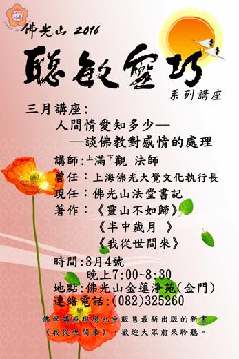 佛光山金蓮淨苑將於明(4)日,晚間七時至八時三十分推出一場佛學講座(圖為活動海報),這是佛光山於農曆年後在金門開辦的首場猴年《聽敏靈巧》系列講座之一,將邀請滿觀法師為大家講演「人間情愛知多少│談佛教對感情的處理」,歡迎佛光好友及各方信眾前來聆聽,共結法緣。 滿觀法師,來自臺灣花蓮。中國文化大學日文系畢業。一九九一年依止星雲大師出家。曾任佛光山叢林學院日文佛學院教師、佛光文化事業公司總編輯、上海大覺文化執行長,現為佛光山法堂書記室主任的滿觀法師筆耕多年,有《靈山不如歸》、《半中歲月》、《我從世間來》等著作。 滿觀法師指出,人因為有情愛牽絆,所以輪回生死;人因為有情感,因此稱為「有情眾生」。所謂「愛不重不生娑婆」,父母相愛,我愛父母,我的情識之中含藏了許多愛和不愛的種子,所以投生到人間,並因為愛而累劫在生死裡沉淪,但佛教並不排斥感情,而是主張以慈悲來運作感情,以理智來淨化感情、以禮法來規範感情、以般若來化導感情。 金蓮淨苑永勤法師也表示,如果愛得不當,固然愛如繩索、枷鎖,會束縛我們,使我們身心不得自由;但是,如果能將愛昇華為慈悲,則愛如冬陽,可以溶化冰雪寒霜,可以激發人性的真善美,實不失為一種鼓勵向上的力量。 這會是一場法喜充滿的講座,時間就在明晚七點至八點三十分,地點在金蓮淨苑(物資處後方),電話:325260、325404。