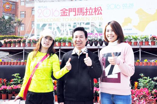 圖文/楊水詠 2016金門馬拉松賽除了有肯亞優秀跑者選手參加外,台灣跑者選手多達四千二百餘人;其中,一對來自台北母女檔(右圖)和一位台中林姓跑者昨日也來金門參加金門馬拉松,他們巧遇陳縣長開心合照外,並有志一同在金門這塊英雄島,挑戰歷史和創紀錄。 第一次來金門的許姓女跑者與媽媽結伴參加金門馬拉松,一下飛機就到金門大學熟悉場地和感受馬拉松賽前氣氛。這一對母女檔對於參加金門馬拉松很開心,女兒挑戰半馬,媽媽參加11K。女兒說之前都參加國外馬拉松,這次來金門跑跑看,也體驗具有戰地軍事文化的視覺與聽覺的感受。而,媽媽說,金門很乾淨、很棒! 另,一位來自台中的林姓跑者也是第一次來金門,也是首次參加金門馬拉松賽;他說久聞大名,而且從未來過金門,此次參加的是全馬;林姓跑者說,以前在台灣曾參加過馬拉松,這次只求完賽!同時,他開心的說,參加馬拉松外,也要品嚐金門美食和高粱酒,也順道買金門伴手禮回去與親友分享!